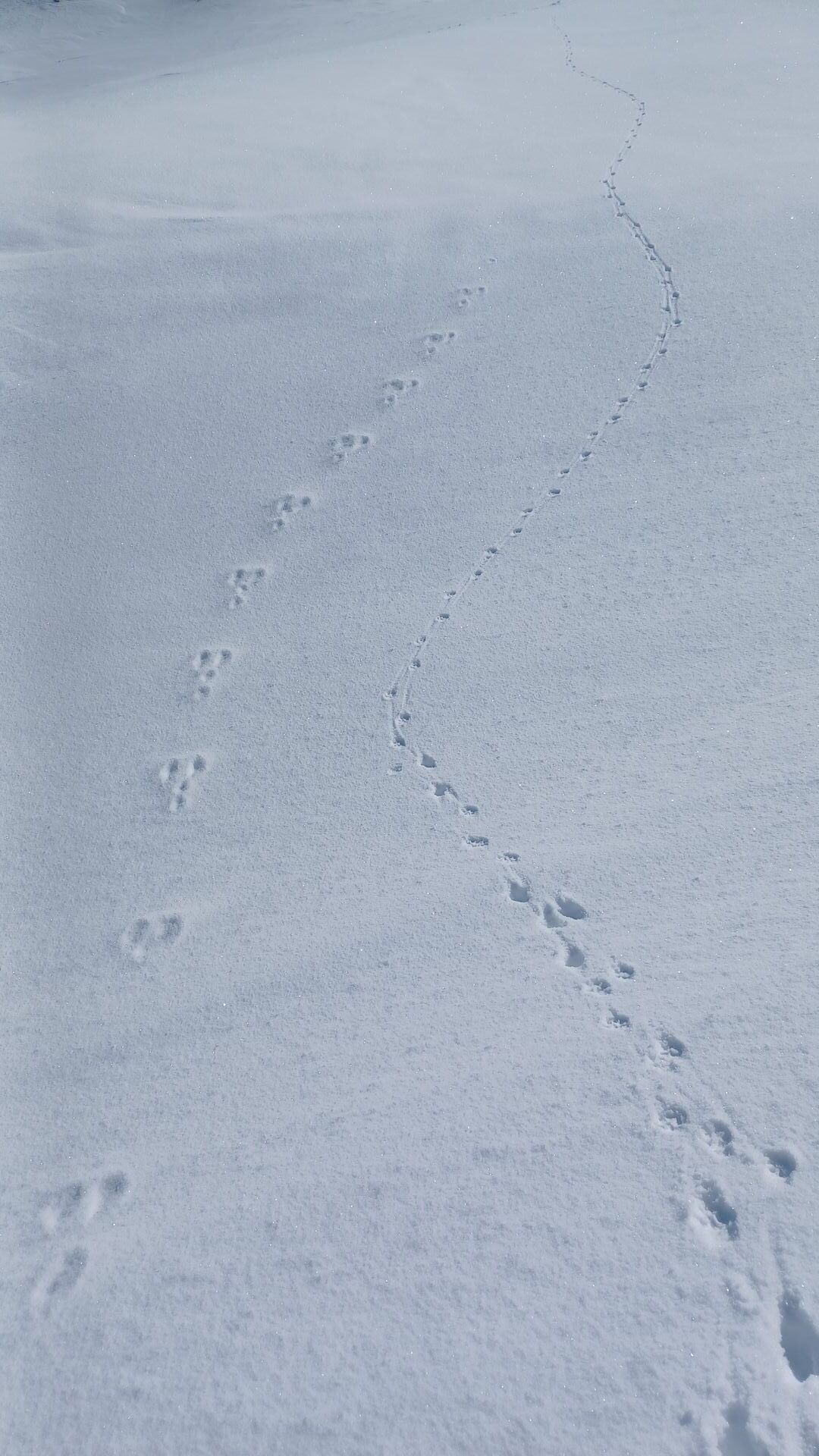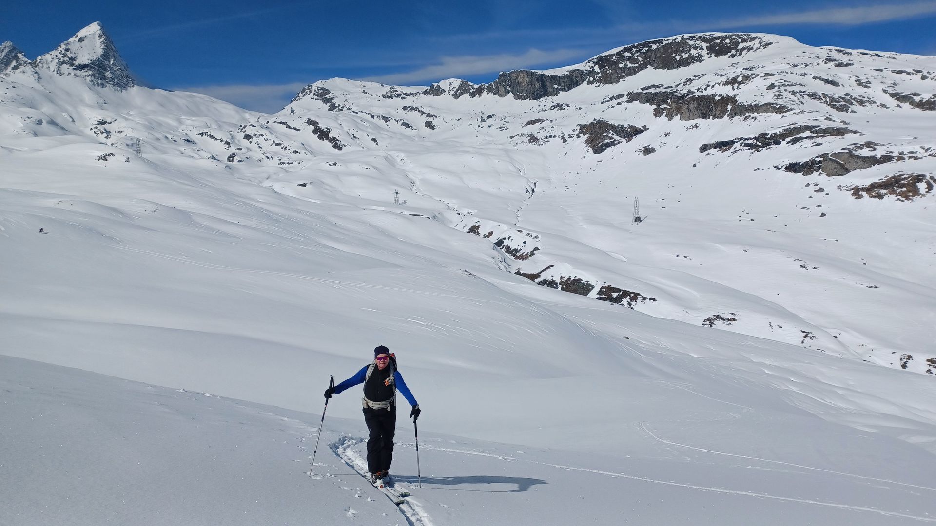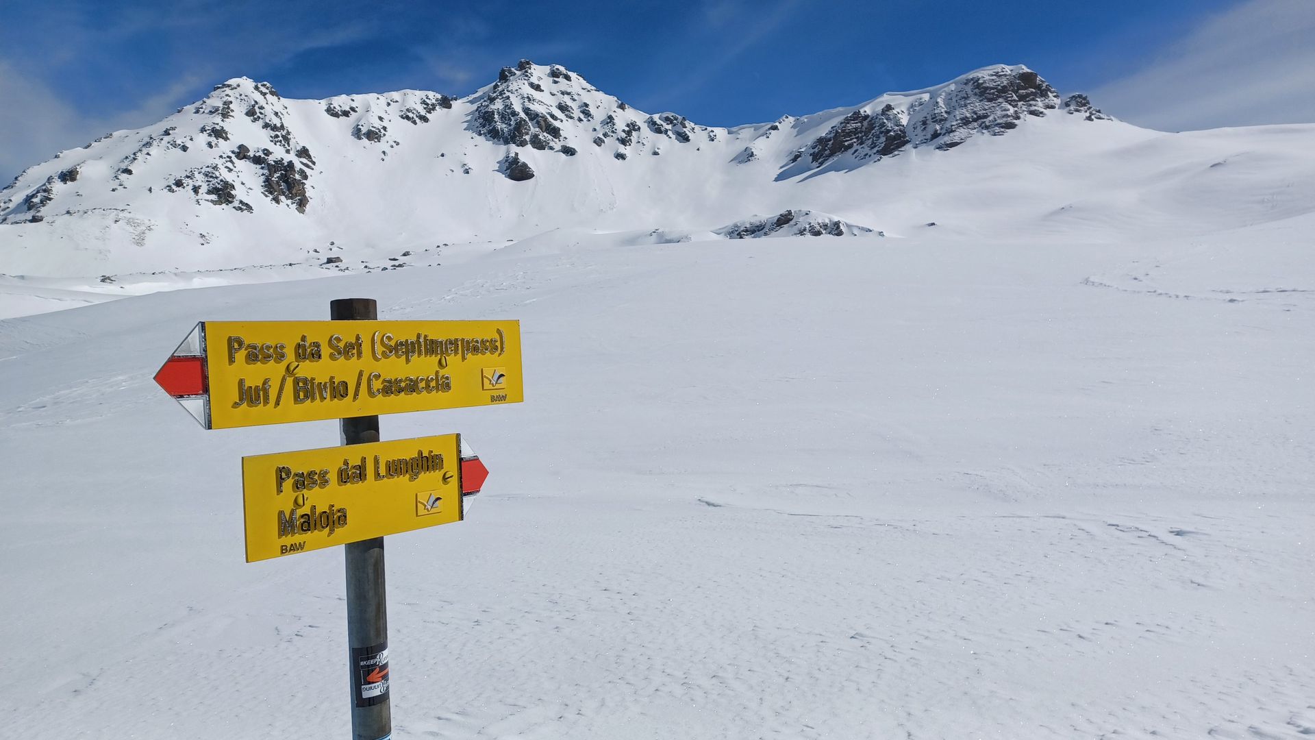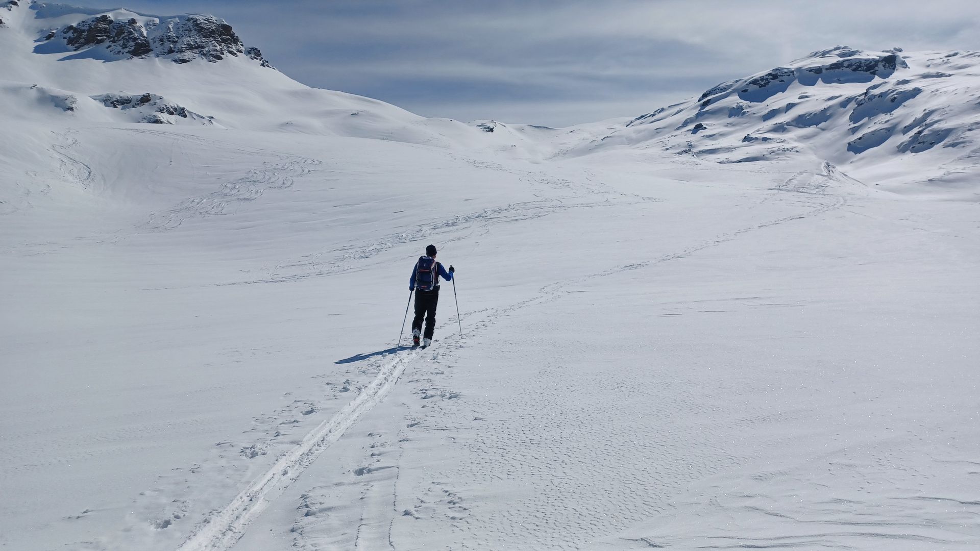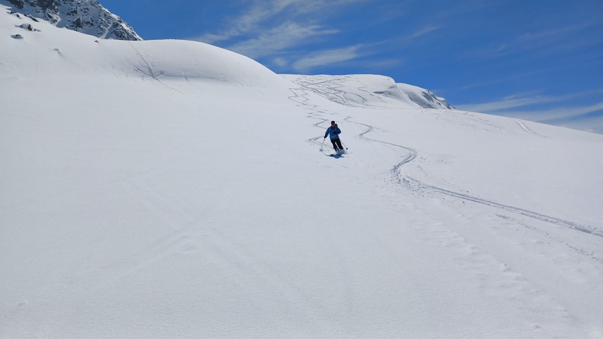 Einsamer Aufstieg, teilweise mussten wir selber spuren, denn der Neuschnee der letzten Tage und der Wind hatten die Landschaft wieder in ein makelloses Weiß verwandelt. Später sind dann noch 4 Personen nachgekommen. Fantastische Sicht ins Bergell und unverspurte Pulverhänge bestätigten die richtige Entscheidung.