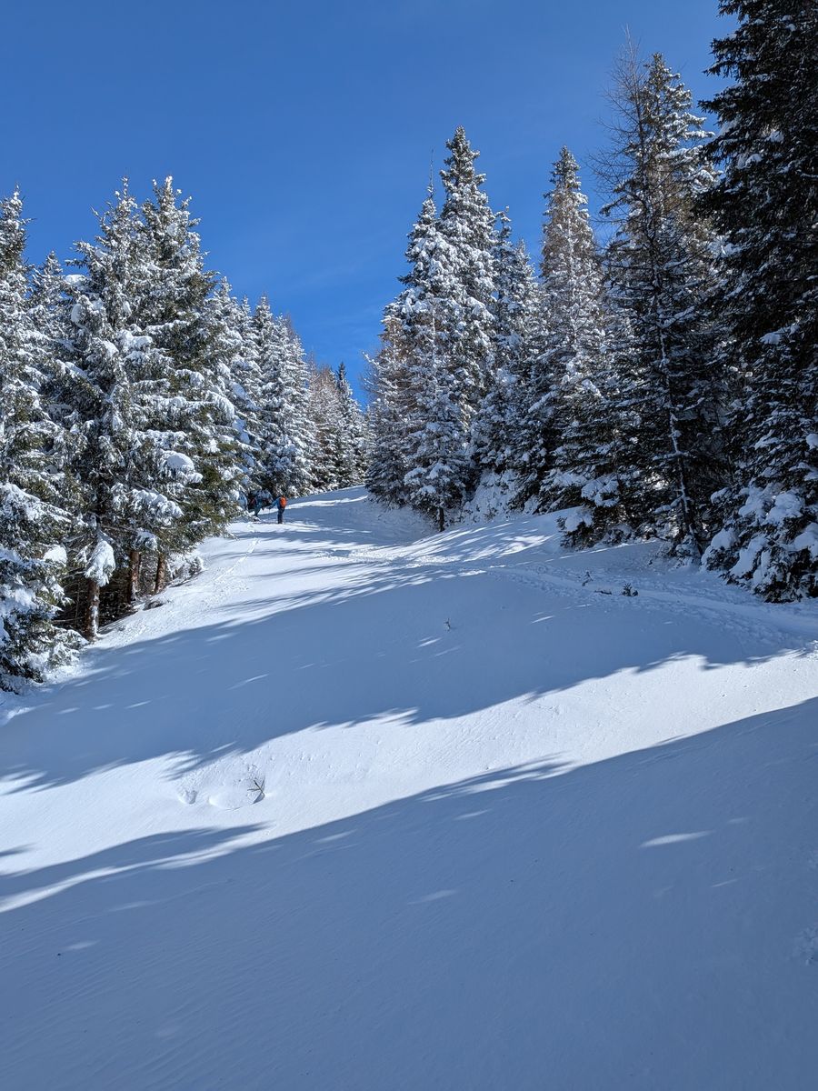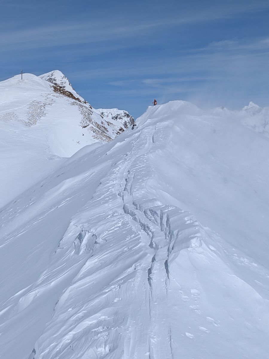 Neuschnee bis zum Parkplatz. Ab welcher Höhe noch eine Unterlage vorhanden ist,konnten wir aufgrund der Menge des Neuschnees nicht wirklich feststellen. Auf den ersten ca hundert Höhenmetern jedenfalls noch keine Unterlage, aber 20-30cm Neuschnee, weiter oben bis ca 2000m 30-40cm Neuschnee. Oberhalb 2000m dann im Bereich des Aufstiegsrücken wieder weniger, da mehr oder weniger abgeblasen.