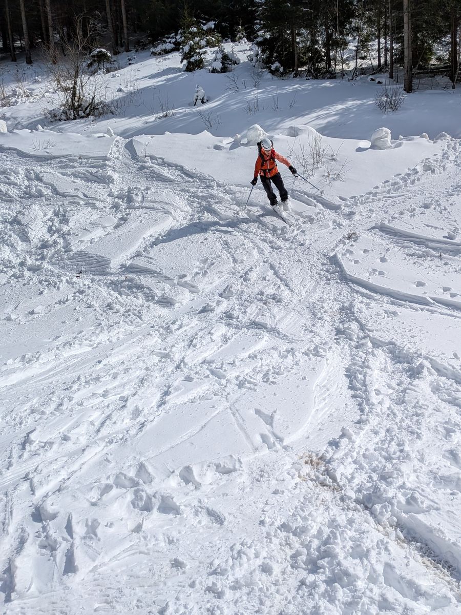 Beim Schnee war so ziemlich alles dabei: hart, wenig Bruchharsch, viel Wind gepresster Pulverschnee, unterhalb der Enzianhütte auf der ehemaligen Anfahrtspiste zunehmend tiefer, schwerer Schnee. Ab ca 1700m abwärts wurde die Abfahrt dadurch zu einem ziemlich anstrengenden Geackere.