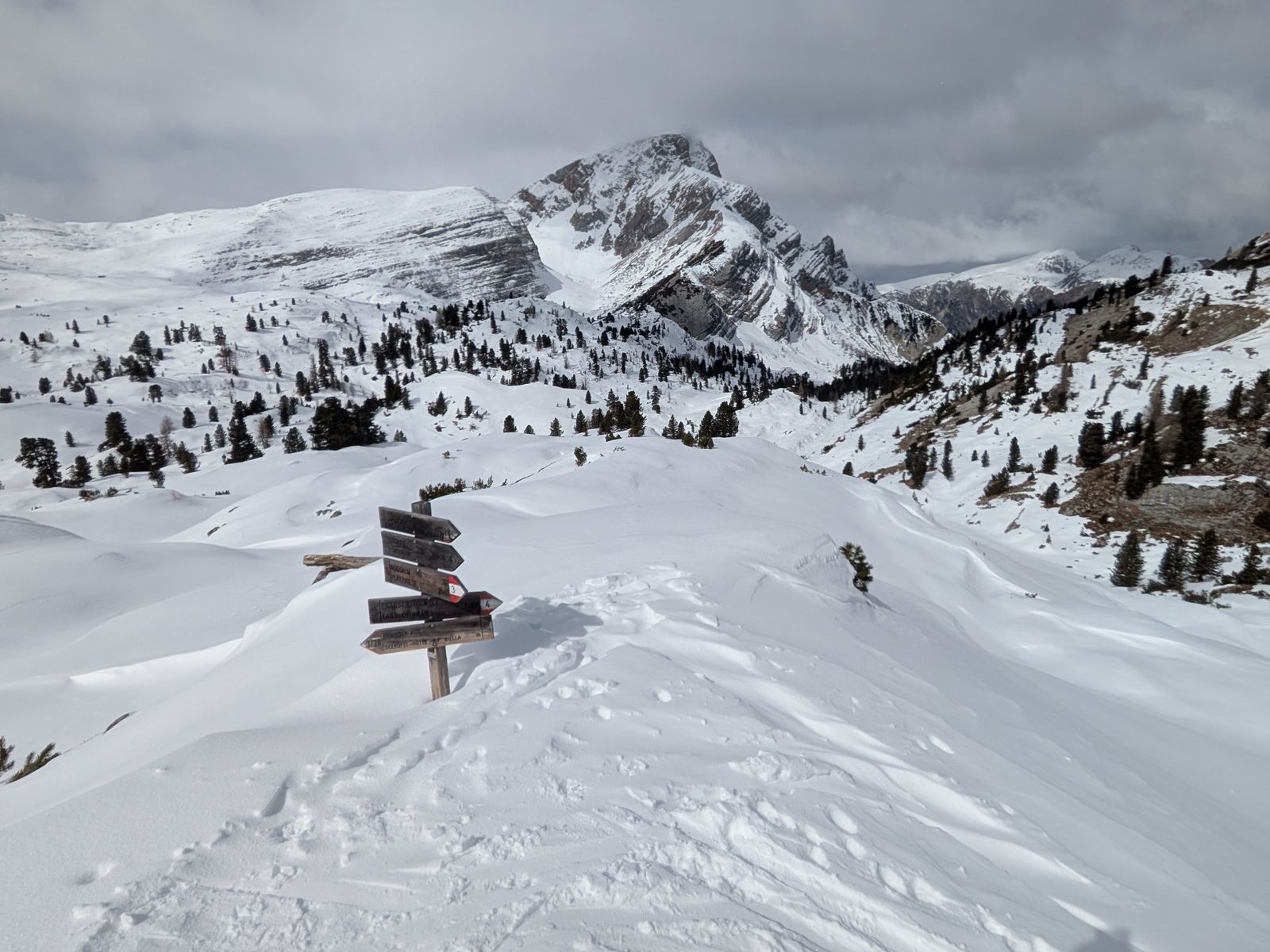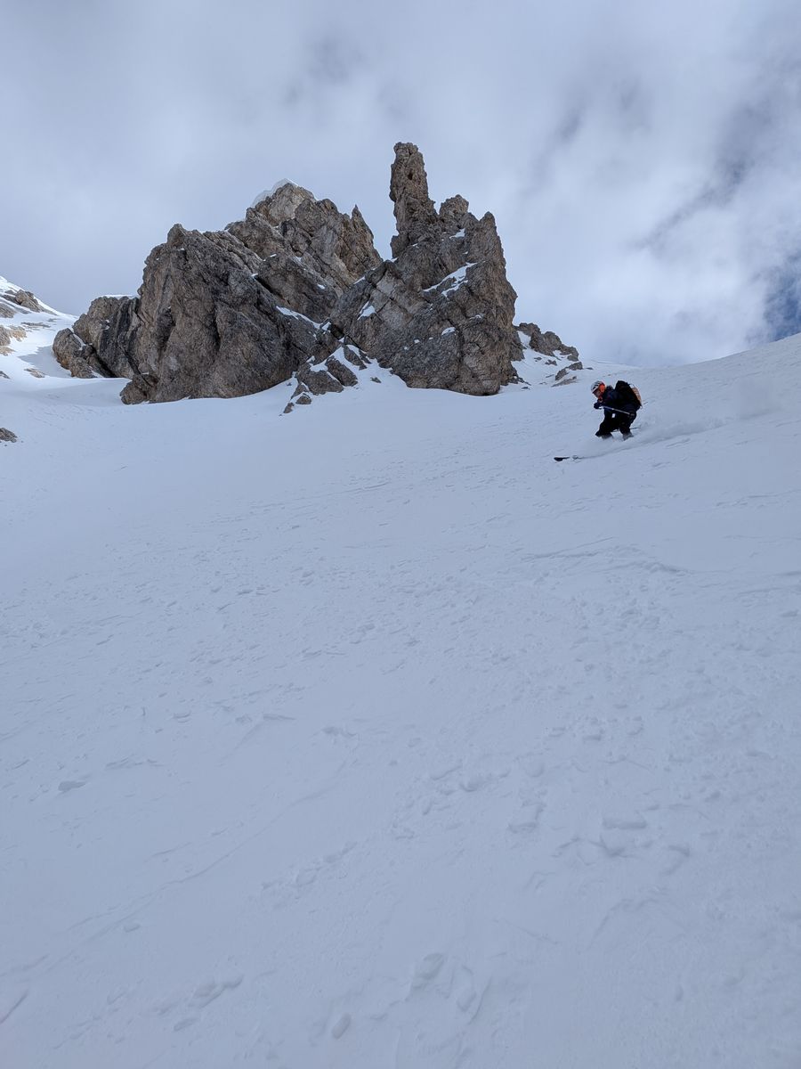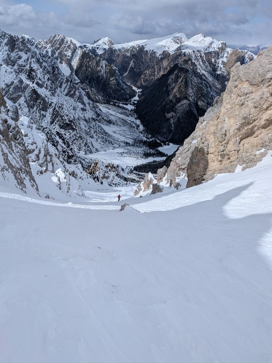 Abgefahren sind wir das Kar nördlich des Gipfels Richtung Pragser Wildsee. Dazu vom Gipfel Richtung Nordost nahe der Abbrüche bis zur Scharte, in welcher das Kar beginnt.