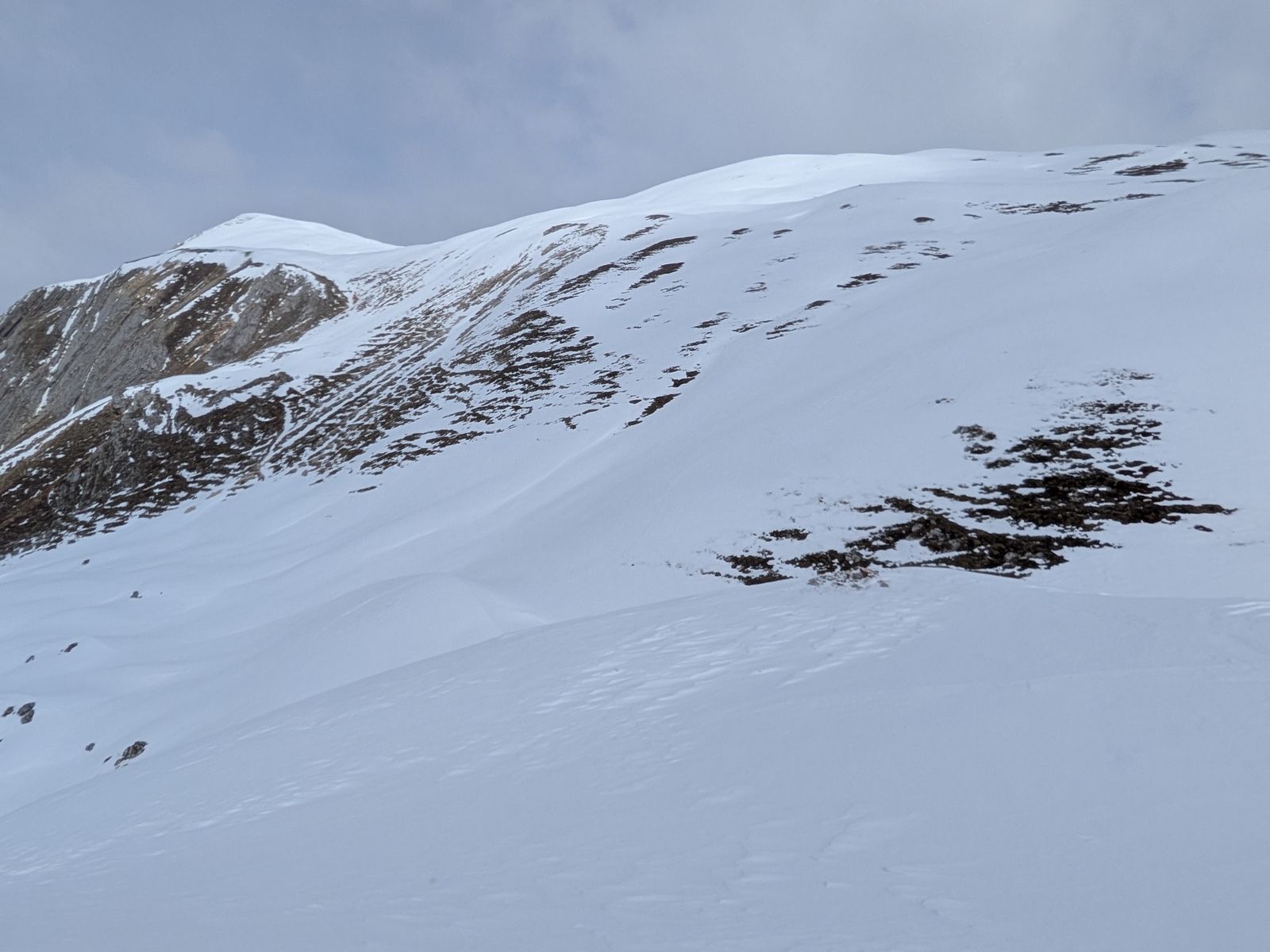 Wetter stark bewölkt, im Gipfelbereich deutlich weniger Wind als gestern, erneut völlig allein unterwegs.