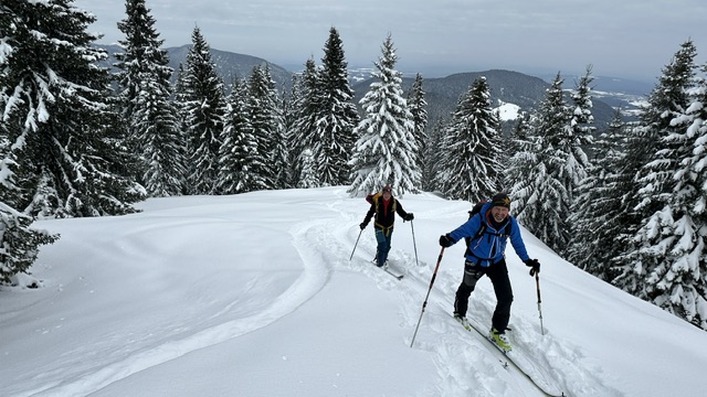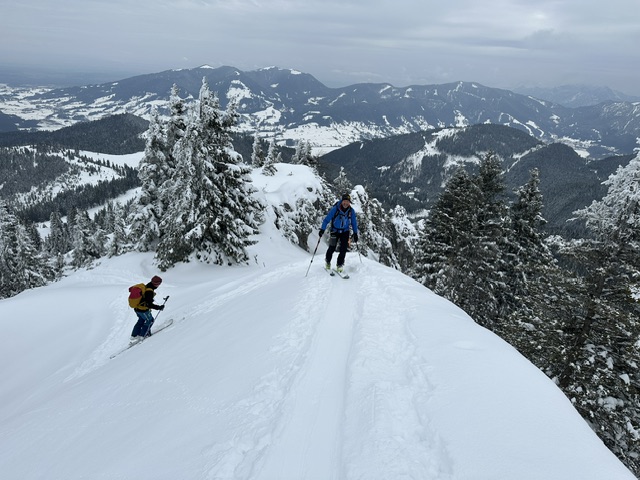 Unser Ziel, der Teufelsstättkopf, erfreute uns mit tiefwinterlichen Verhältnissen vom Parkplatz an der Schleifmühlklamm weg. Nach dem gemütlichen Start auf der Forststraße wird es nach der Kuhmoosalm steiler und am Ende fast etwas luftig. Gute Stapfspur vom Skidepot zum Gipfelkreuz. Dort hatten wir eine mittelprächtige Fernsicht, die Sonne kam nicht durch, was aber den Vorteil hatte, dass wir in der Abfahrt sehr schön zu fahrenden Pulverschnee genießen konnten. Das Lawinenrisiko war überschaubar, allenfalls gleich an der ersten Einfahrt in den Steilhang musste man schauen.