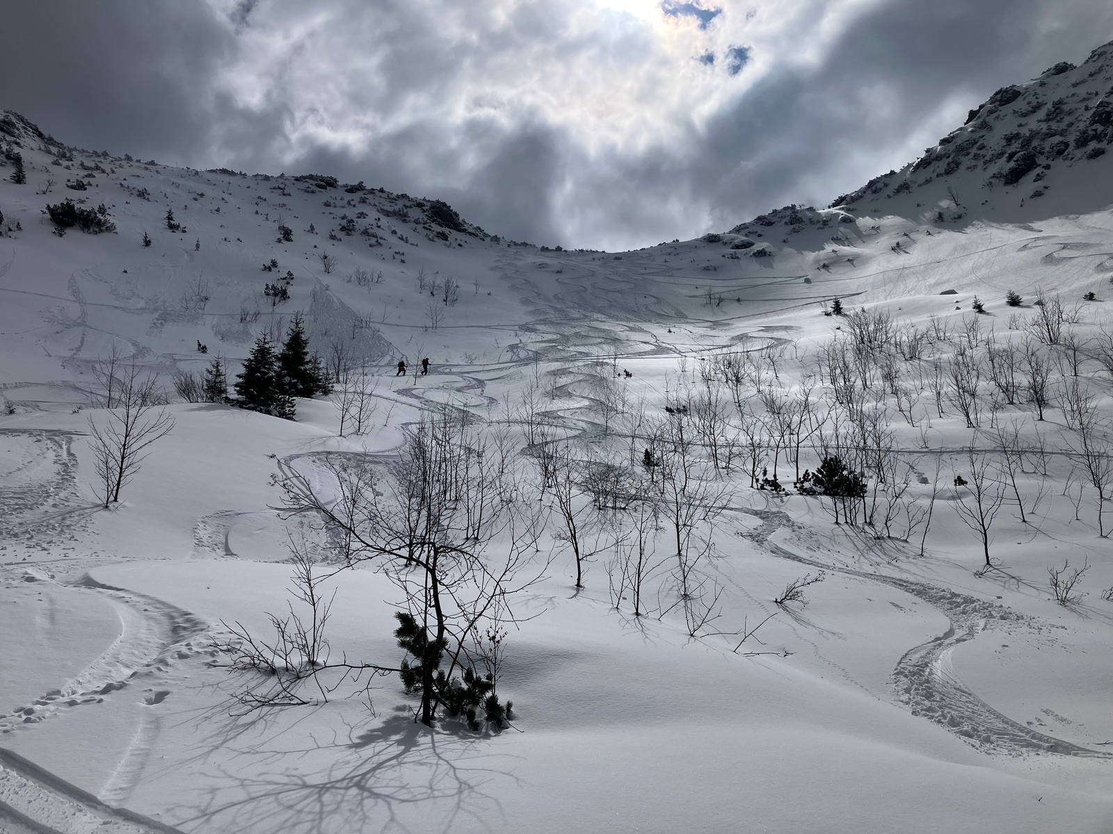 Die klassische Plankenstein-Reibn habe ich noch etwas erweitert um den Nordhang im Riedereckkessel. Toller Pulver, noch gibt es auch Platz für eigene Spuren. Vom Plankensteinsattel schattseitig auch noch pulvrig, aber schon einige Spuren. Ab ungefähr den Röthensteiner Seen nur noch bremsender Schnee und so musste mit den alten Skiern für die Abfahrt doch ordentlich angeschoben werden.