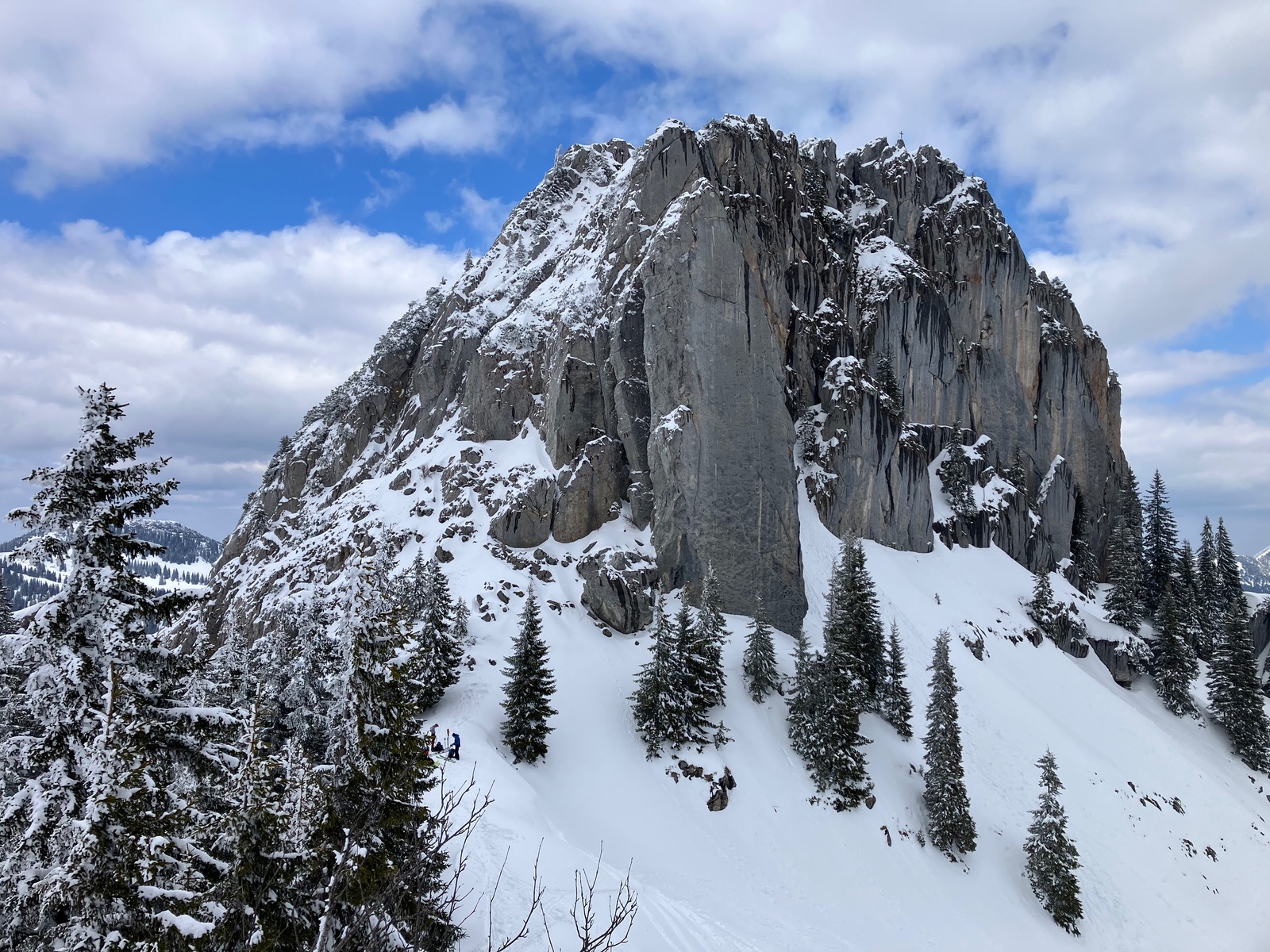 Im Waldbereich machte sich dann die Erwärmung v.a. in Form von heruntertropfendem Schnee bemerkbar und ja, man kann auch ohne Niederschlag nass werden. Und sobald weiter oben Stellen mit trockenerem Pulver kamen, machte sich der unter den Fellen bemerkbar.