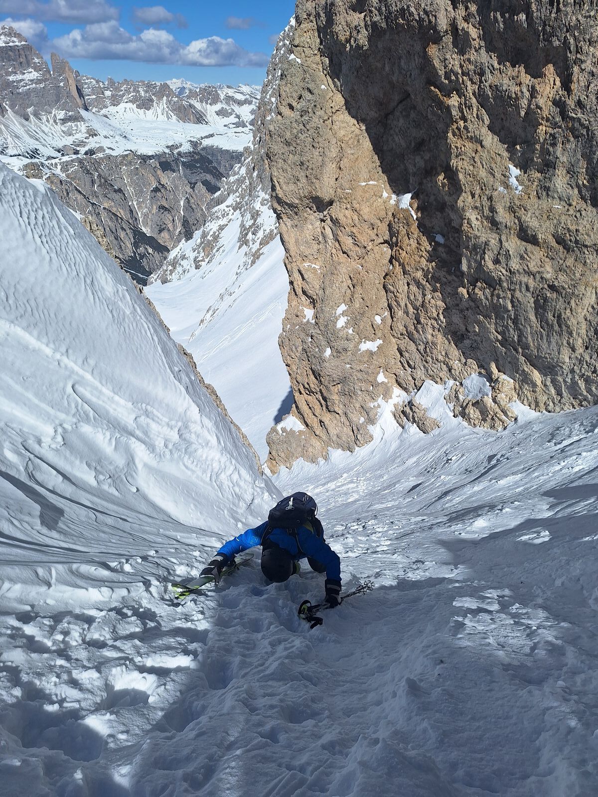 Viele nordseitigen Dolomitenkare, wie Cristalloscharte, gehen sehr gut und sind noch ohne Tragestrecken länger gut machbar.