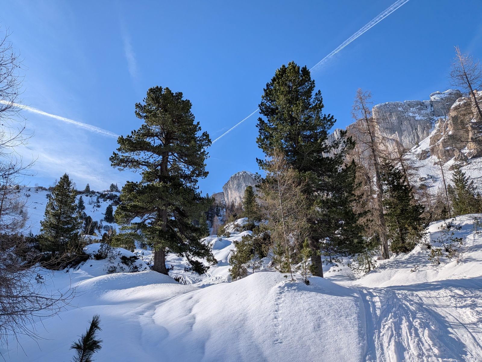 Lawinengefahr: Keine auf meiner Route. Richtung Steinernes Törl bin ich aber anders als letztes Mal (siehe Bericht dazu) bewusst nicht gegangen. Dort und aus der Nordwestflanke der Dalfazer Wände waren ab 10.30 viele Lockerschneerutsche zu beobachten.