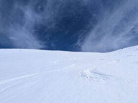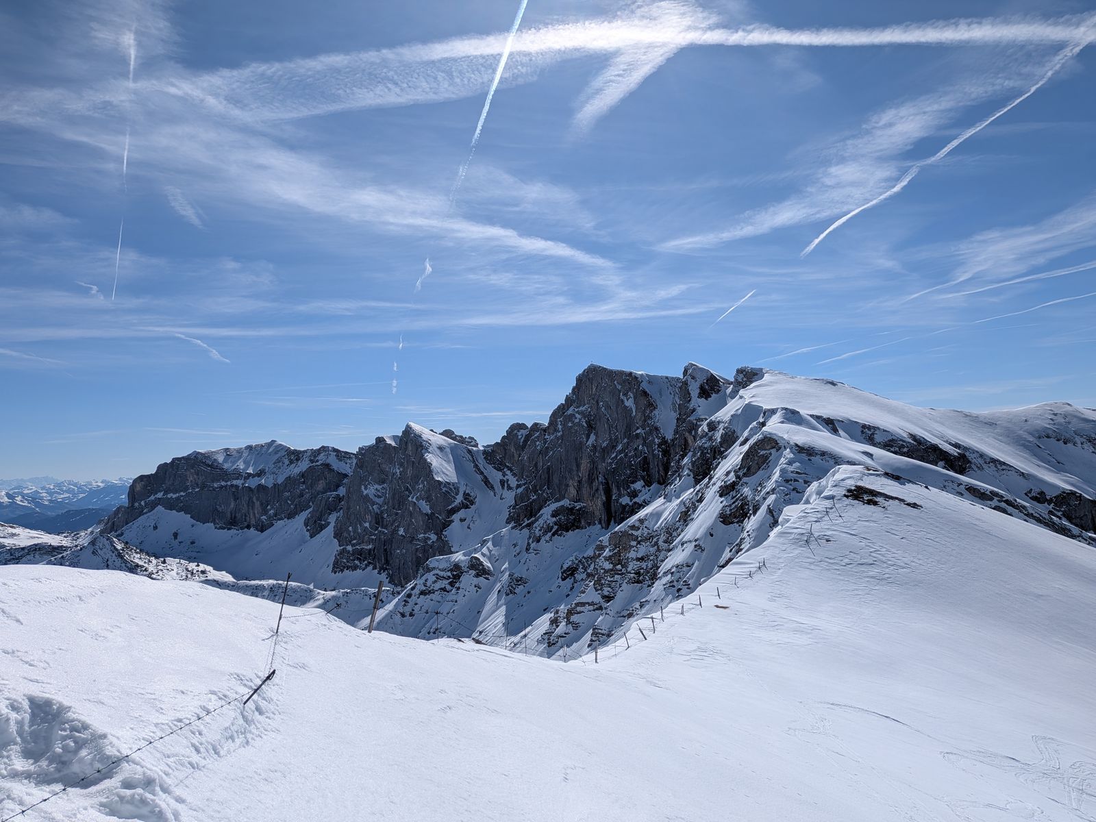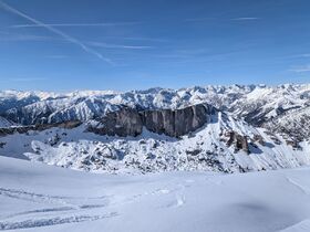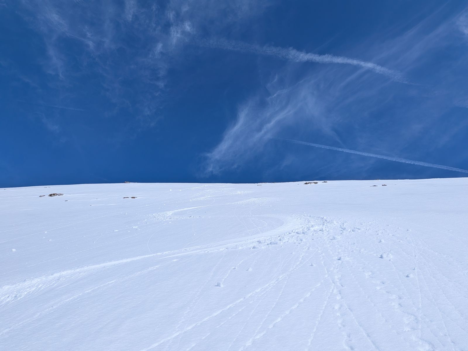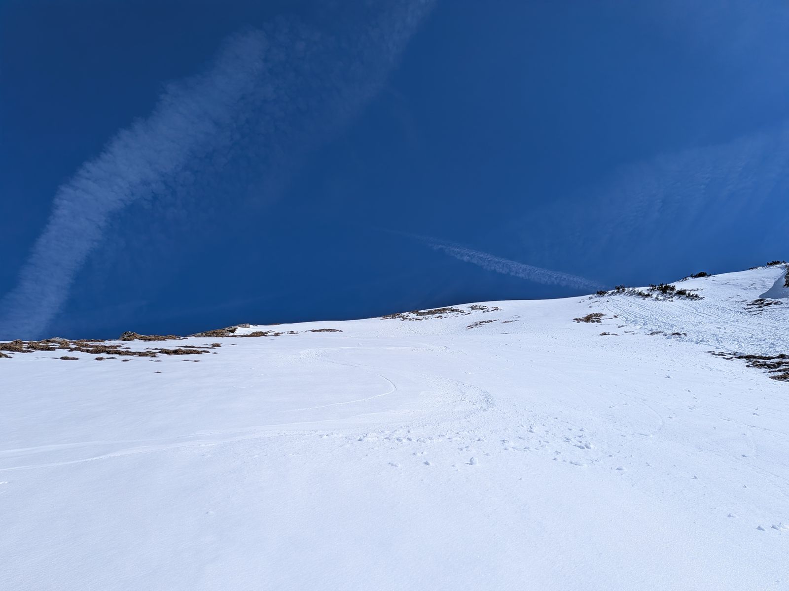 Zwischen 9.45 und 12 Uhr bin ich den Gipfelhang vier Mal gefahren, wobei die Bedingungen bei Nutzung der Feinexposition jedes Mal gut waren - nur die letzte Abfahrt war schon auf der sulzigen Seite, aber ohne Durchbrechen. Grundsätzlich war zwischen Auffirnen und Sulz immer nur ein sehr kleines Zeitfenster vorhanden - da hab ich's gut erraten.