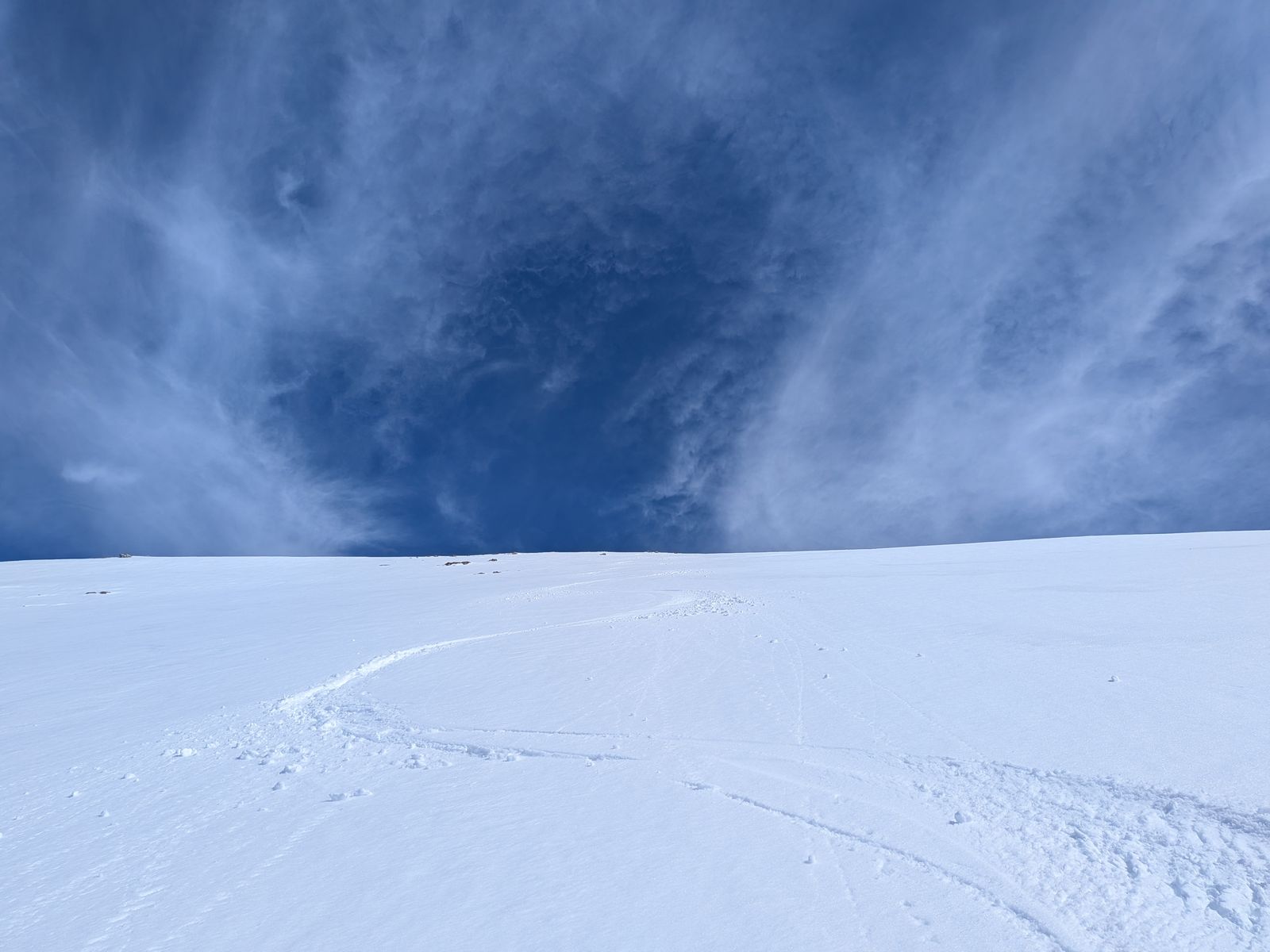 Ab dem Mittelleger dann ausreichend harter Schnee, der aber ohne Harscheisen ging. Schöne Spur vorhanden.