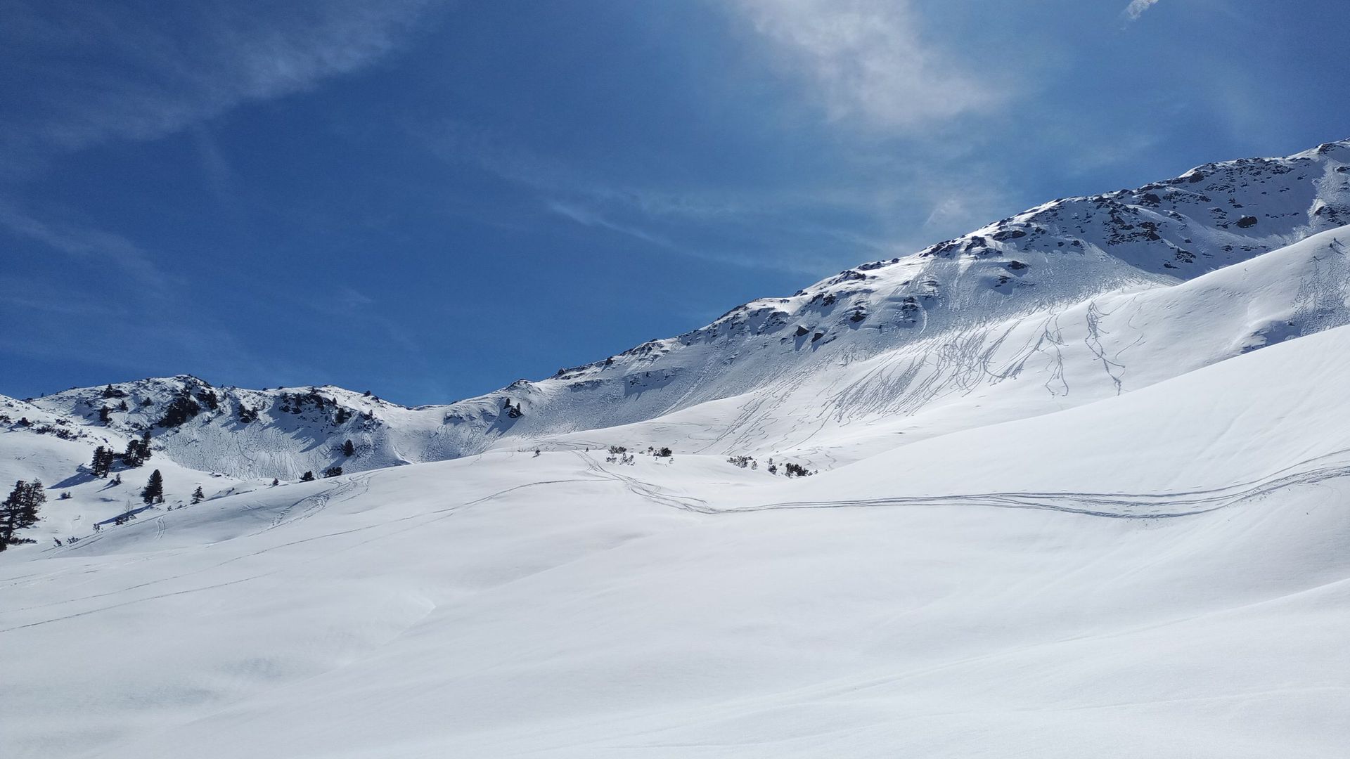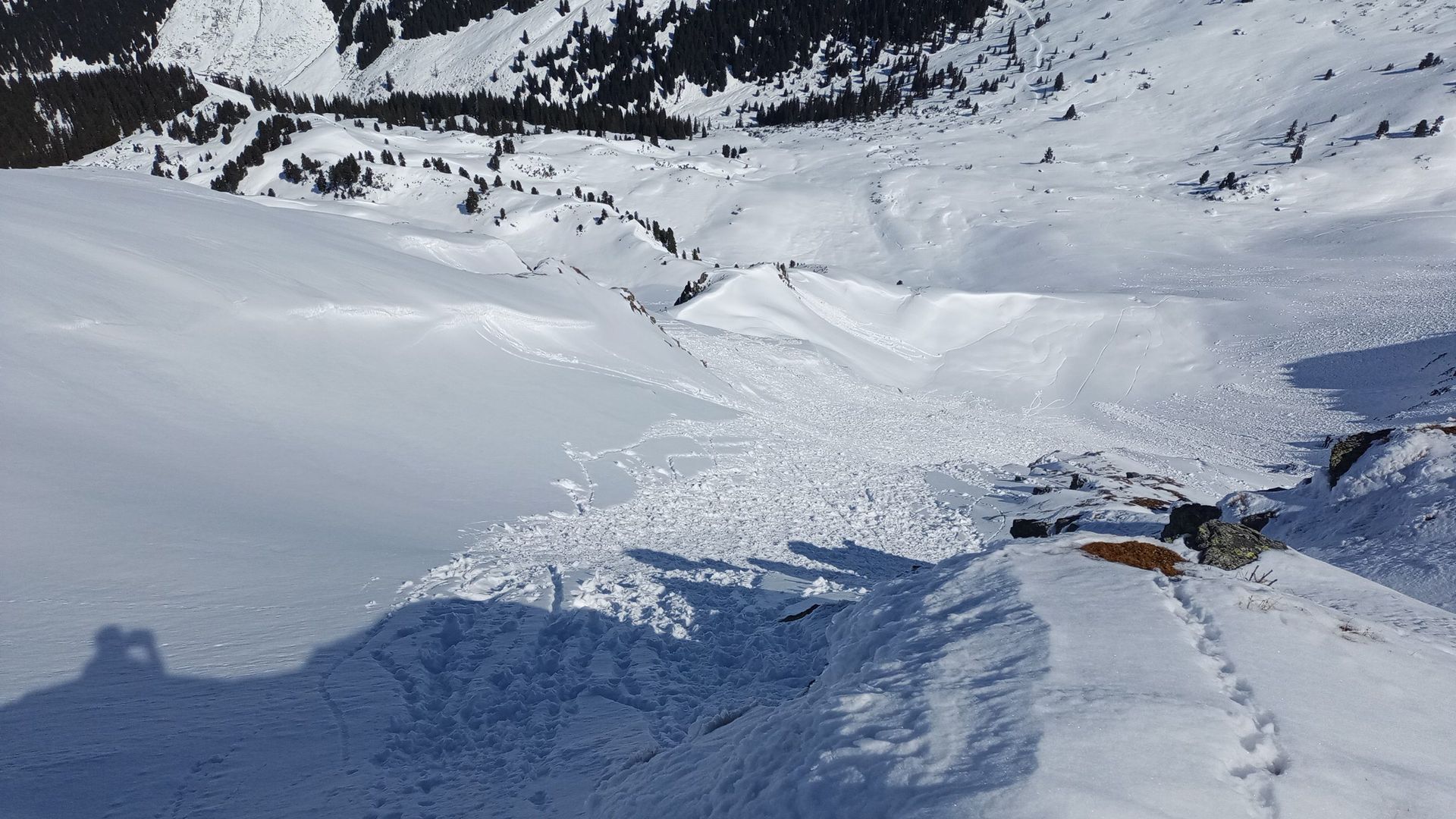 Die direkte Gipfelabfahrt schien zu kritisch. Viele Schneeboller und ähnliche Hänge (Steilheit, Exposition) in der Umgebung hatten spontane Lawinenabgänge drin.