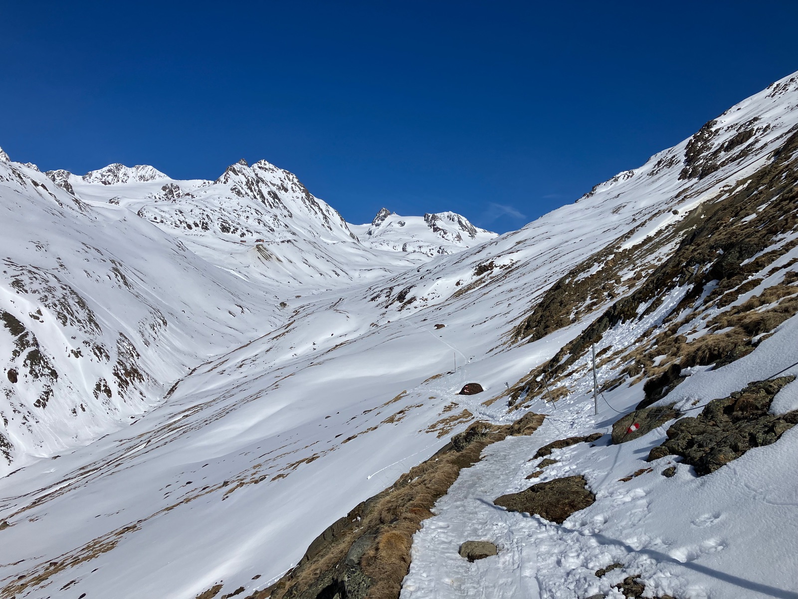 Wenn man sich auf der Südseite des Rofenbachs (also der Schattenseite) hält, kann direkt von Vent aus gestartet werden (Winterwanderweg und Loipe - offiziell gesperrt wegen Lawinengefahr und auch entsprechend "verrammelt"; wobei dies bisher jedes Jahr so war - keine Ahnung, ob das grundsätzlich jedes Frühjahr gemacht wird). Von Rofen hinter zur Talstation der Materialseilbahn liegt auch noch durchgehend Schnee, aber schon deutlich weniger. Also falls es weiter so abartig warm sein sollte wie heute, könnte es bald apere Stellen geben. Den Südhang hinauf zum Vernagtegg geht man im Aufstieg am besten auf dem Sommerweg, der aber schon einige noch jeweils kurze apere Stellen aufweist (am besten einfach drüber gehen). In der Abfahrt kann man die aperen Stellen in einer Art Graben umgehen, aber lawinensicher ist das nicht. Insgesamt liegt im Tal auf steilen Südhängen nur noch wenig Schnee. Die fallende Querung beim Vernagtegg geht durchgehend mit Skiern, hinzu hinab (eisig, etwas unangenehm - das Drahtseil ist auch nicht durchgehend) und zurück leicht bergauf (deutlich angenehmer). Es liegt an dieser Stelle aber schon wenig Schnee und leider wird die Passage meistens schnell von abschnallenden Tourengehern zertrampelt, obwohl es eigentlich mit Skiern besser und auch sicherer geht.