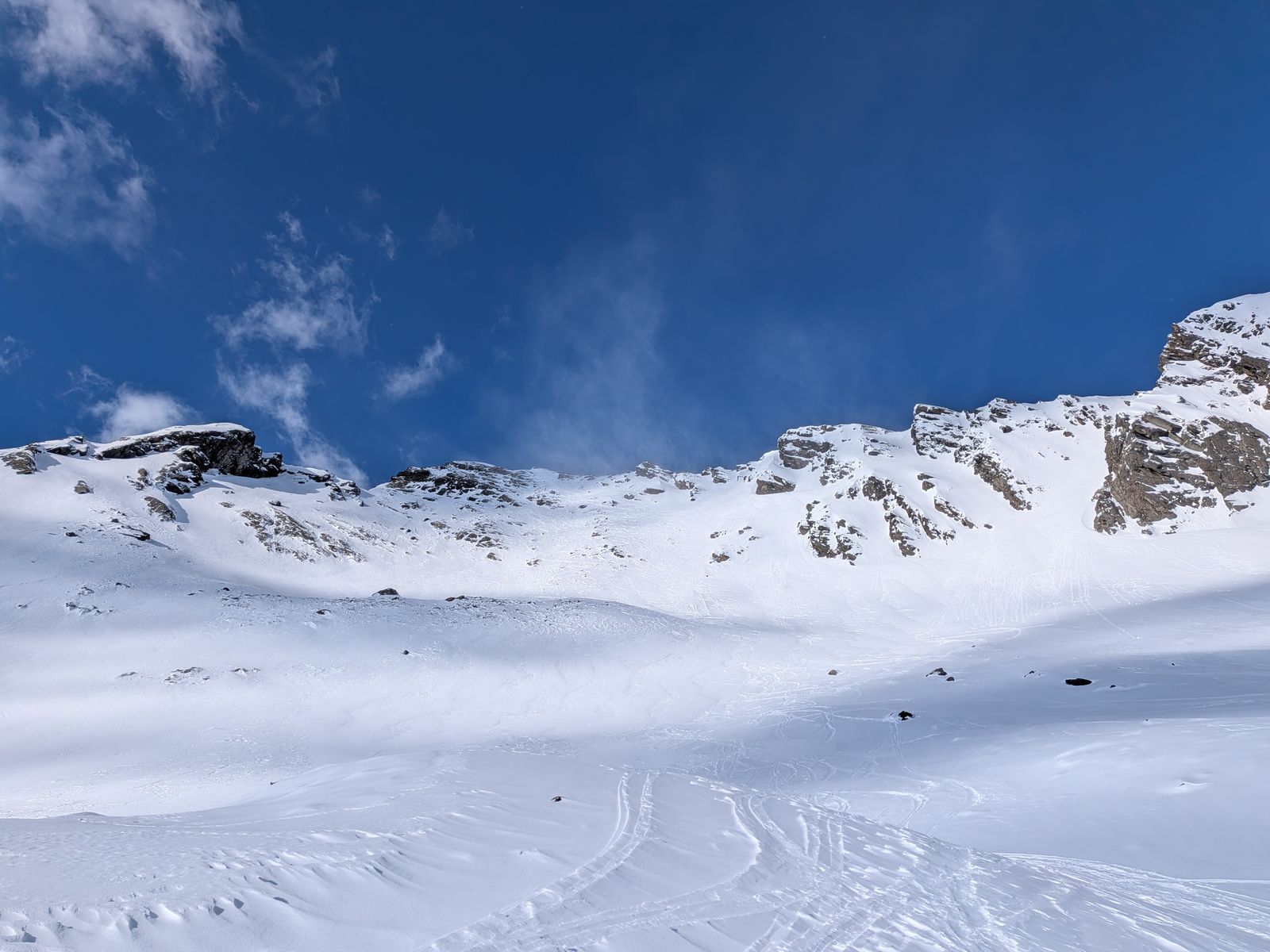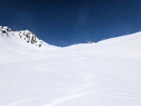Ich bin auf dem üblichen, markierten Anstieg durch den Wald hoch, wobei ich auch einen Blick in die steile Schneise geworfen habe, durch die eine oft genutzte Abfahrtsvariante führt. Diese hatte ich für mich aber wegen Lawinengefahr für heute kategorisch ausgeschlossen. An der Karschwelle zeigte sich, dass die Hauptroute großflächig von Lawinen überspült war, was die meisten Kollegen aber nicht daran hinderte, hier trotzdem aufzusteigen, obwohl die Hänge bei weitem noch nicht entladen sind und später da auch noch einiges runterkam. Ich bin lieber auf dem sicheren Moränenrücken aufgestiegen und auch wieder abgefahren. Auf den wie meistens stark abgelasenen Gipfel habe ich, auch wegen stürmischem Wind, oben verzichtet und bin um 9.45 bis etwa 2400 Meter abgefahren und noch mal hoch. Mit Blick für die Feinexposition gab es hier so etwas wie Firn, ohne Blick Bruchharsch... Weiter unten dann um 11 Uhr schön fahrbarer Sulz.