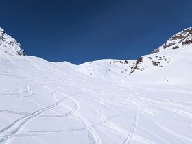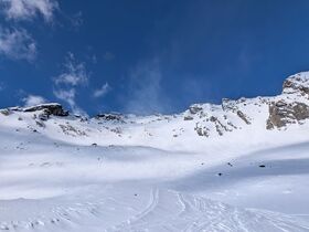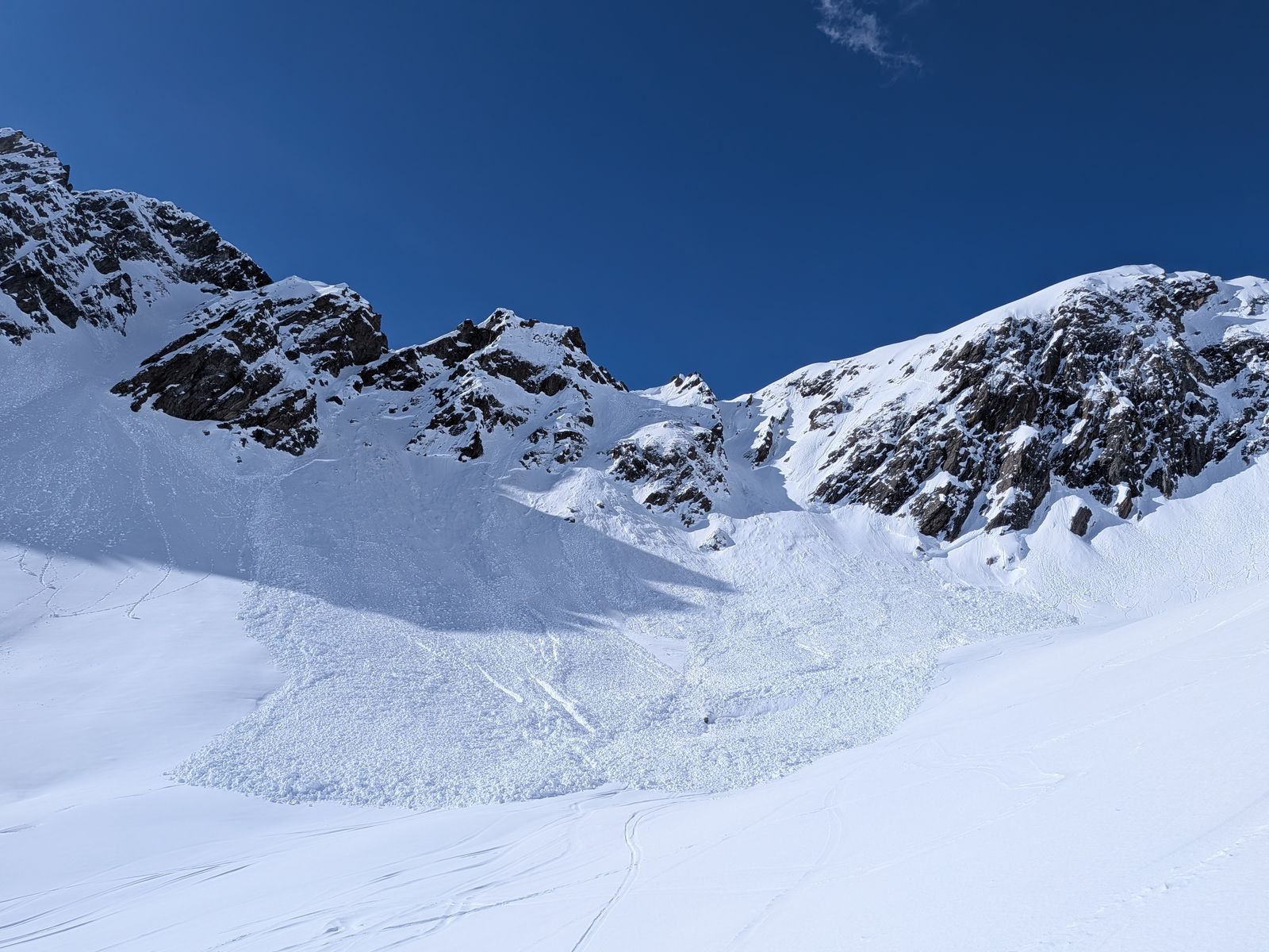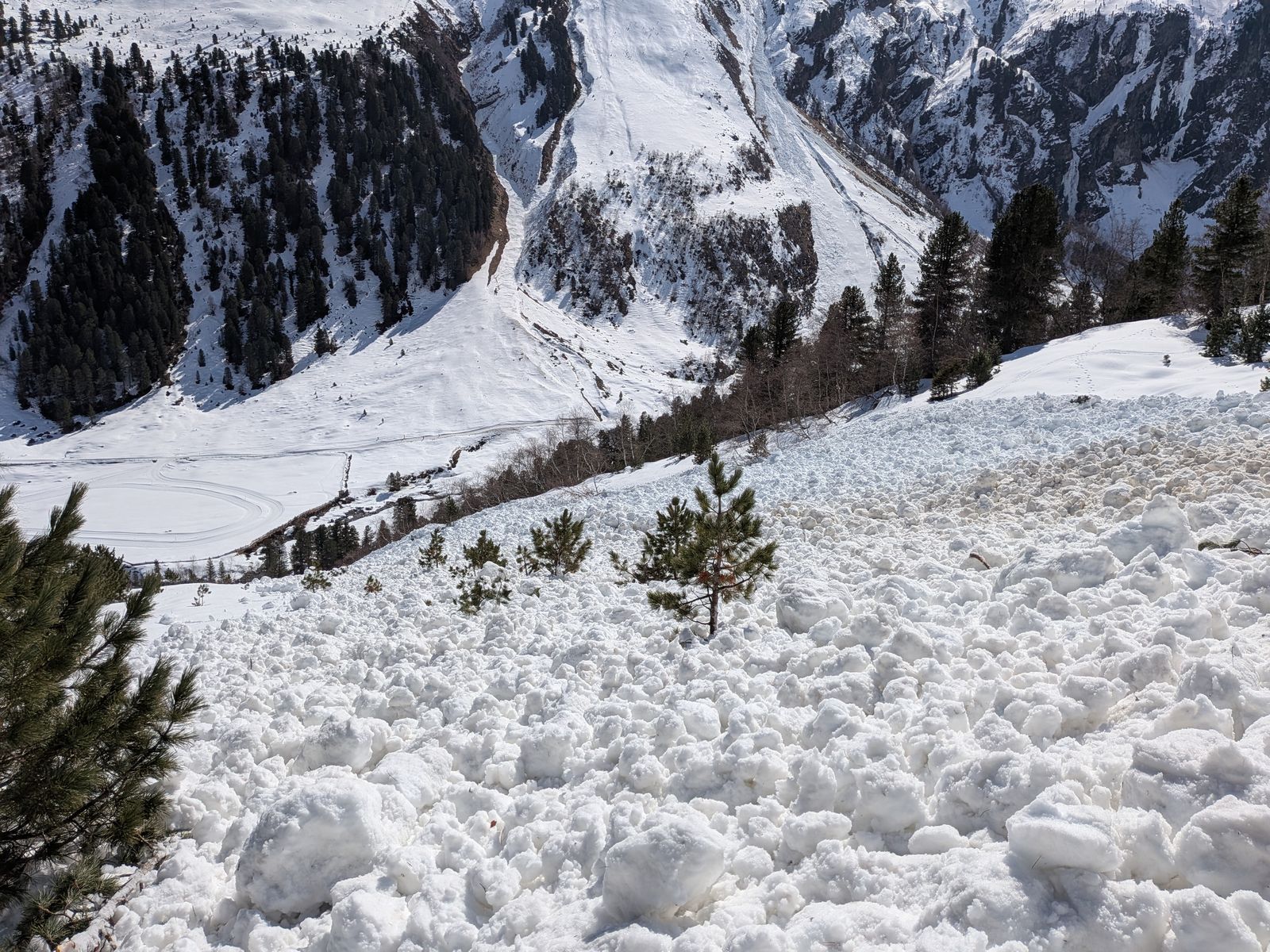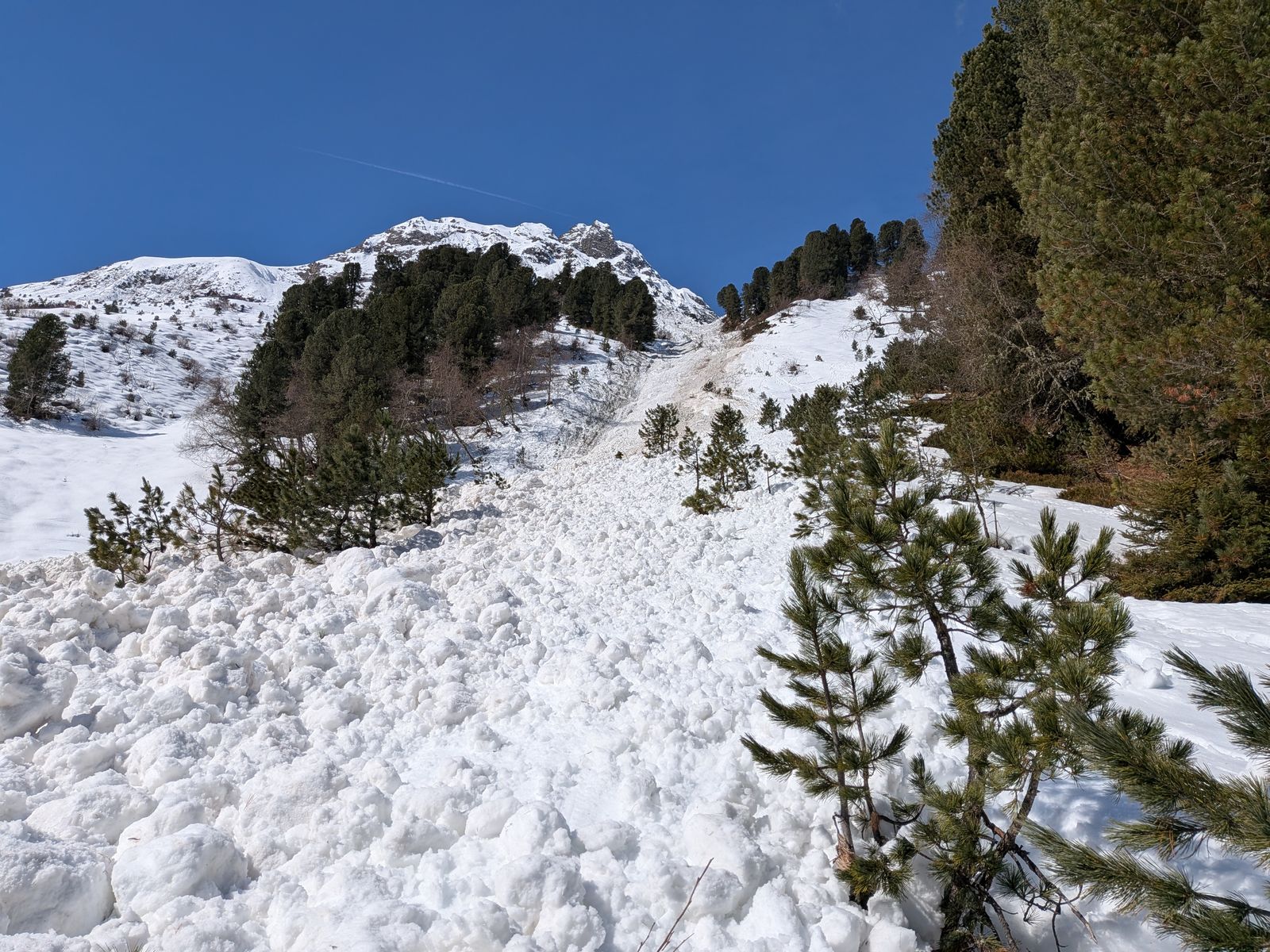Als ich gerade im Wald gefahren bin, gab es plötzlich einen gewaltigen Knall - eine riesige Lawine war durch die steile Schneise geschossen und weiter unten sah ich dann das ganze Ausmaß, denn der Großteil des Nordosthangs war im Stück abgegangen. Da ich nicht sehen konnte, ob jemand die Variante gefahren ist (Spuren von gestern hatte ich schon beim Aufstieg gesehen), habe ich den Notruf gewählt und der Helikopter hat dann die Lawine abgesucht, aber kein Signal orten können.