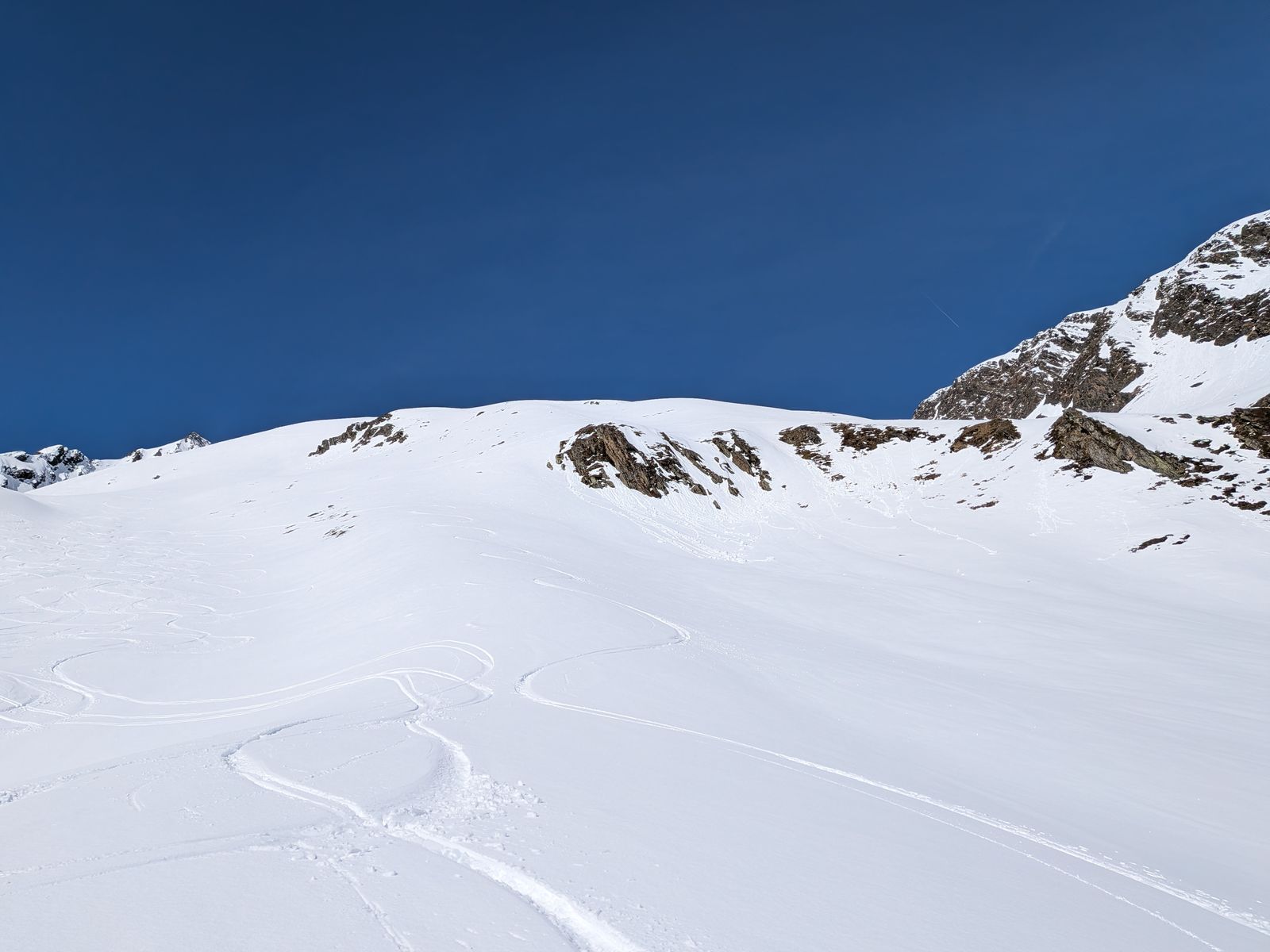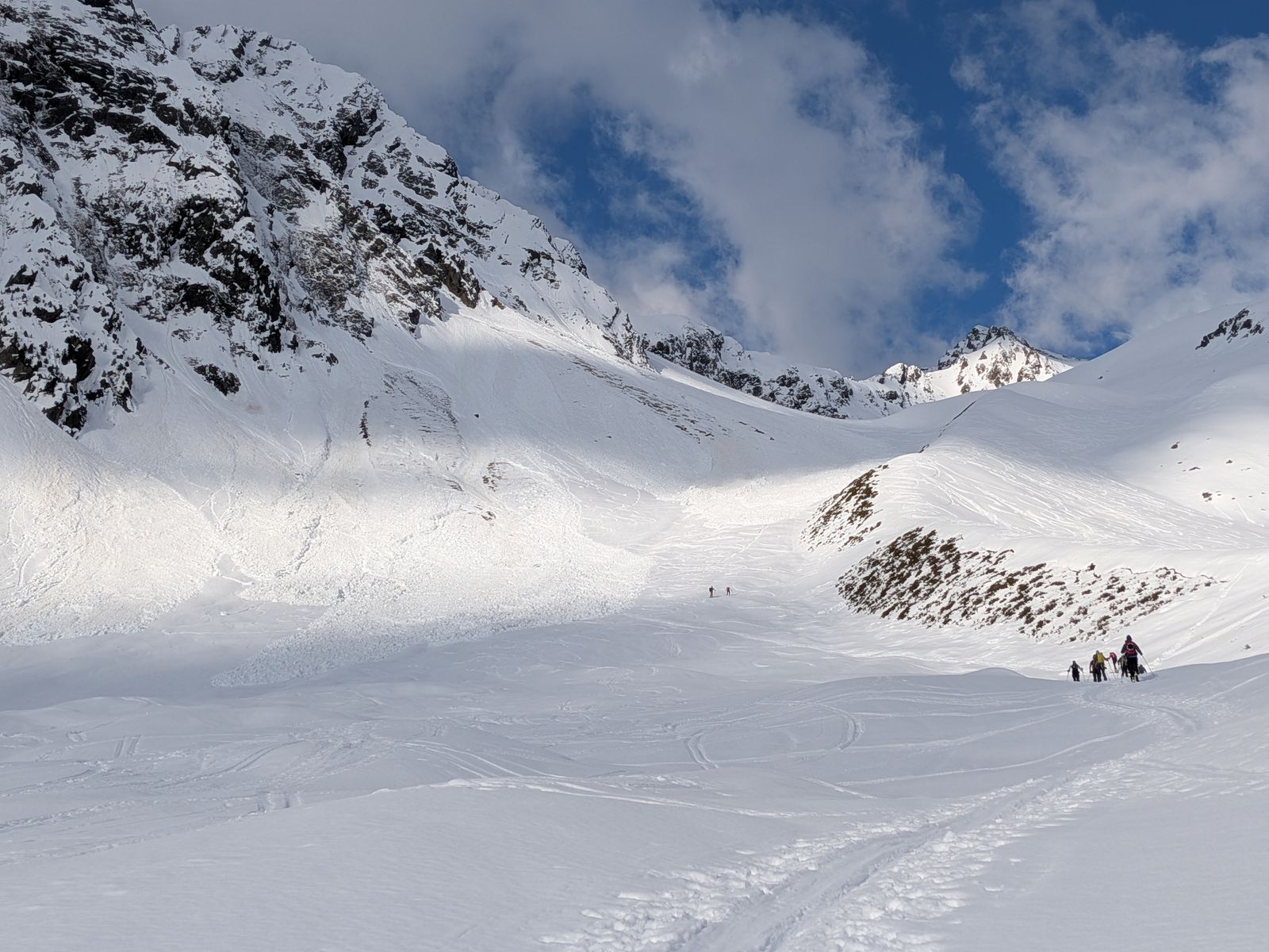 Auf jeden Fall möchte ich Jonas Aussage von gestern unterstreichen, dass momentan bei der Tourenplanung die Einzugsgebiete von Lawinen unbedingt zu berücksichtigen sind. Die Gefahr geht gegenwärtig mehr davon aus als selbst ein Schneebrett auszulösen.