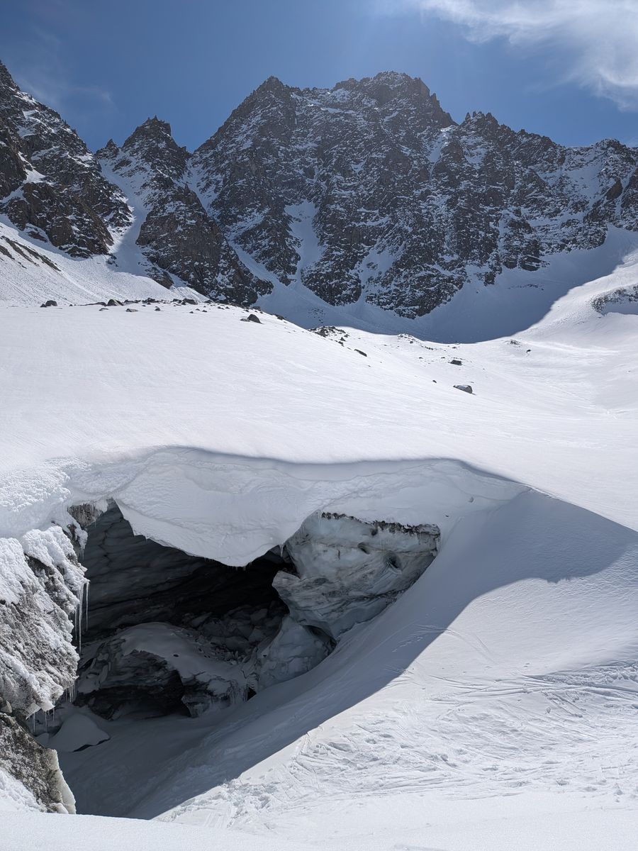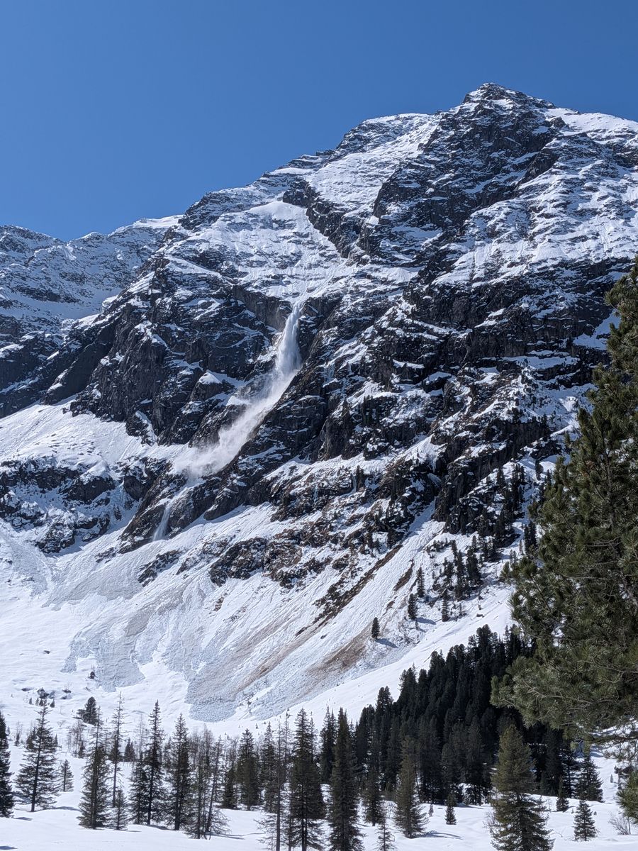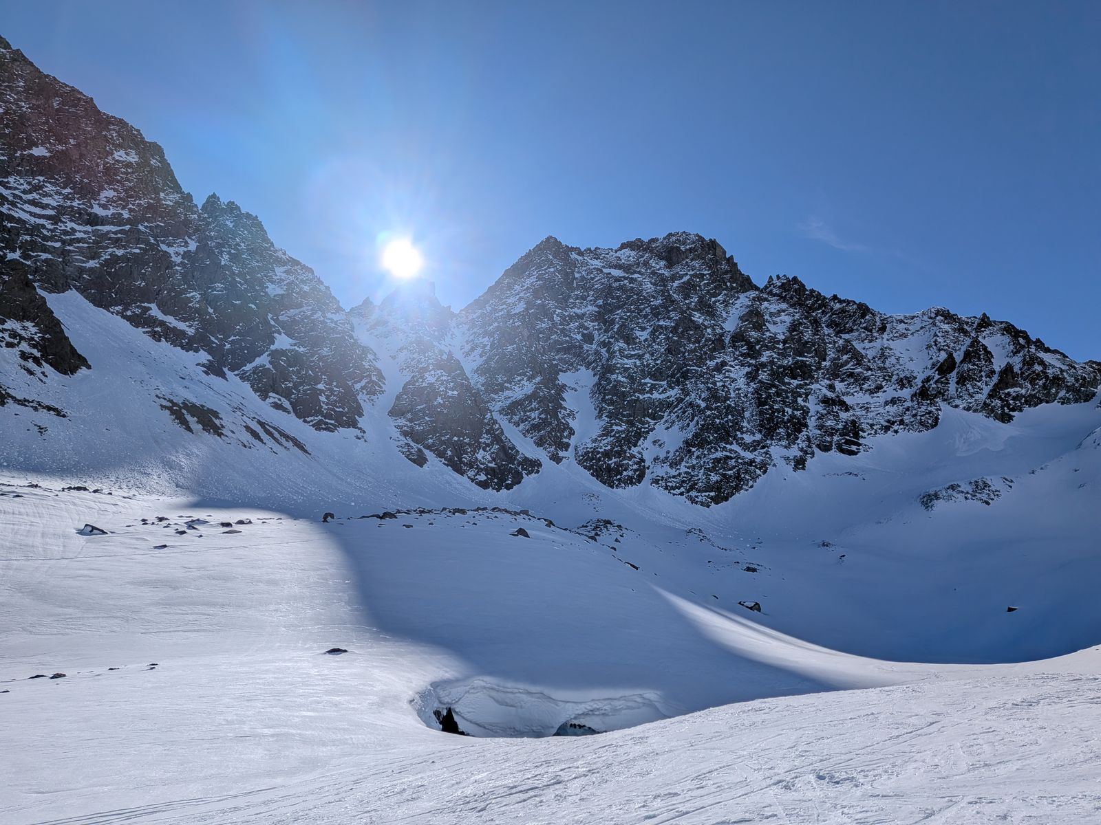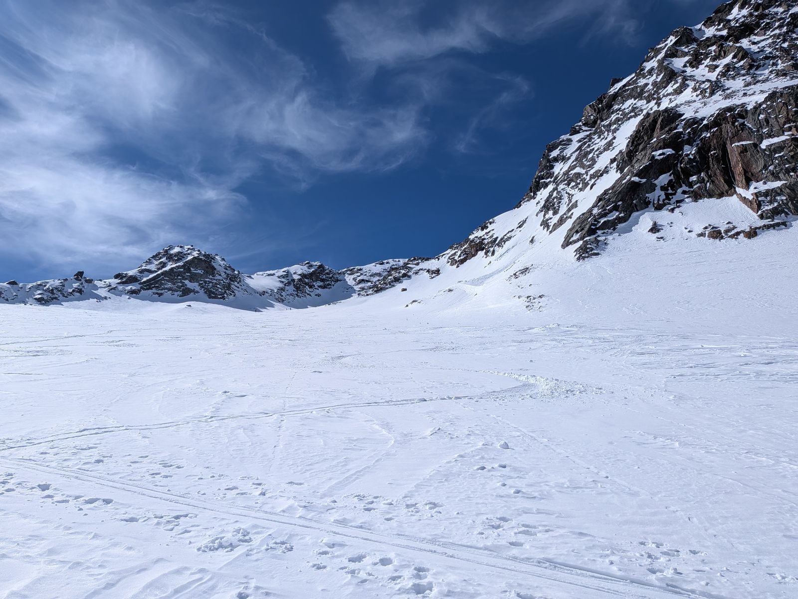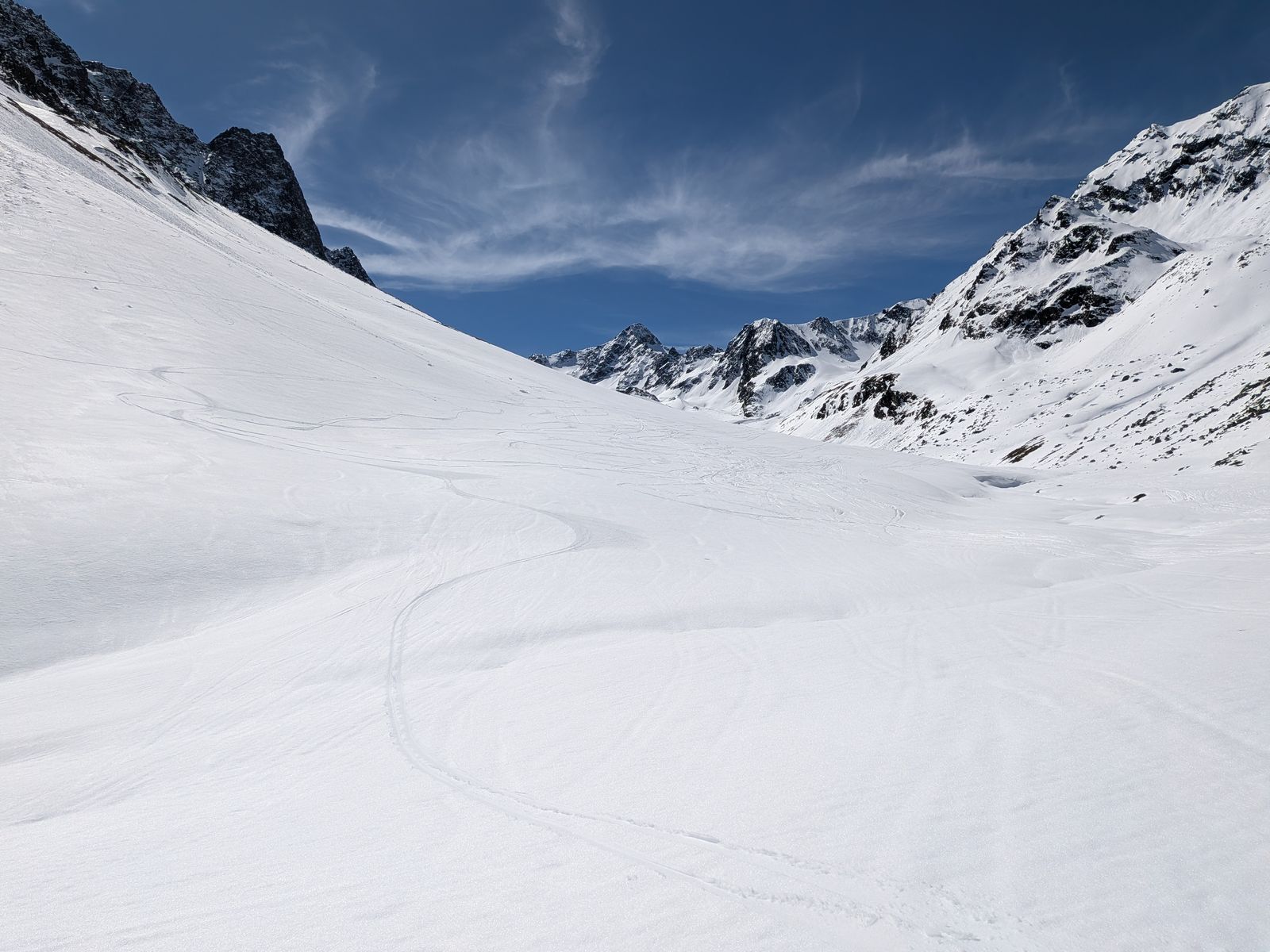 Abgefahren bin ich um 12. Auf dem Gletscher schön zu fahrender Windpulver, dann abwechselnd firnig und hart. Ab dem Flachstück unter dem Westfalenhaus sulzig ohne Durchbrechen. Viel später als 12 sollten man nicht abfahren, jedenfalls nicht, wenn man ins Tal möchte, weil das Flachstück sonst ein rechtes Gemurkse wird.