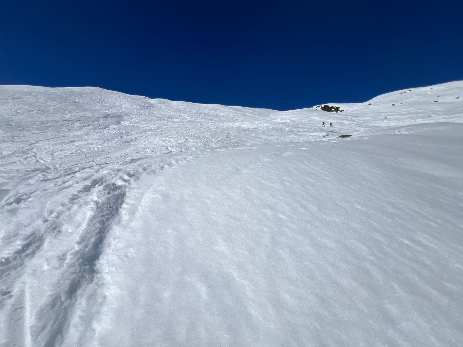Grund: Gegen Mittag brach man im Gelände neben der Hauptabfahrtsroute schon tief ein. Oder man muss so früh dran sein, dass man spätestens gegen 10 abfährt. Dann ist es aber oben vermutlich ganz schön boanig...