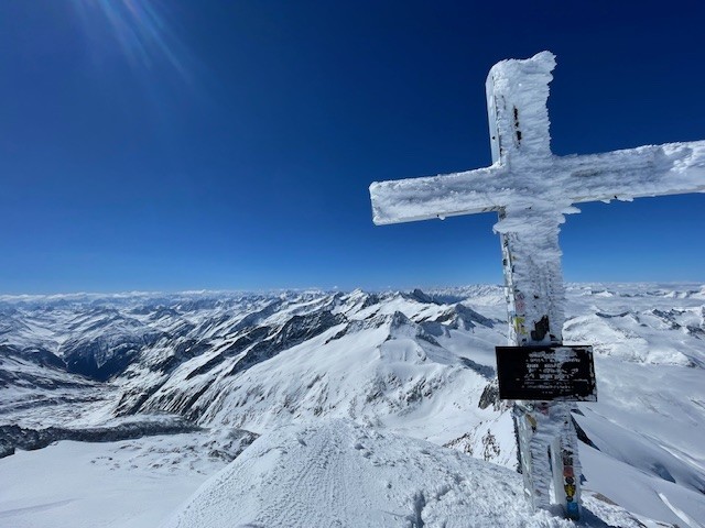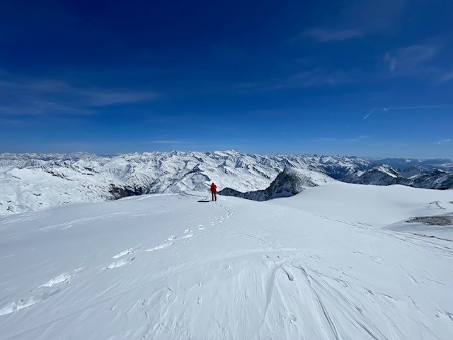 4 Tage auf der Johannishütte - Aufstieg vom Parkplatz mit ca 1/2h tragen, dann entlang der größtenteils zugeschneiten Fahrstraße zur sonnig gelegenen Johannishütte. Donnerstag Aufstieg sehr windig (Nordstau, Berge in Wolken), da Freitag die beste Wettervorhersage war - gleich auf den Großvenediger gestartet. Über das Defreggenhaus (morgens alles hart gefroren), Zustieg zum Gletscher mit wenigen Eisentritten - über gut zugeschneiten Gletscher mit Ski direkt zum Gipfel. Besser gehts nicht - zunächst noch sehr windig - am Gipfel aber windstill- und nur wenige Gruppen von der Johannishütte aus unterwegs (keine von der Kürsinger). Abfahrt optimal aufgefirnt bis zur Sonnenterrasse der Hütte...