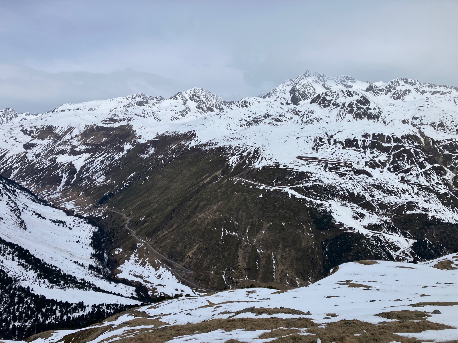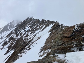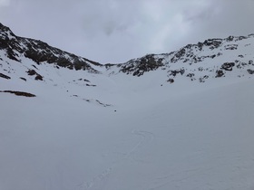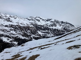 Zum Ramoljoch / Anstiege zu den Spielkögeln konnte am Freitag noch direkt von Vent aus mit den Skiern gestartet werden. Im Waldbereich hält man sich im Aufstieg und auch in der Abfahrt tunlichst genau an den Spurenbereich, daneben war alles nach der bedeckten Nacht sumpfig oder Bruchharsch. Es gab am Freitag auch schon einige kurze apere Stellen im Wald. Die werden angesichts der Witterung sicher rasch mehr. Oberhalb der Ramolalm noch kurz schneearm, dann aber ausreichend Schnee für den Aufstieg und die Abfahrt. Und der war am Vormittag überraschend hart - die Harscheisen schon unten anzulegen, hätte sicher Kraft und Nerven gespart. Die obere Querung Richtung ehemaliger Spiegelferner erwies sich als recht nervig: Meistens Schnee, aber viele Rippen ausgeapert. Da musste man also immer wieder kurz über Steine laufen und so war ich froh um die alten Skier. Zum Ramoljoch ist es die letzten Meter steil, am Freitag auf dieser Seite (Westen) aber eher ausgeblasen. Angesichts der eingetretenen Wetterverschlechterung und damit einem starken Wind habe ich von jeglichen Verlängerungsmöglichkeiten Abstand genommen. Wer einen Gipfel besteigen will, kann aus dem Joch noch hoch zum Kleinen Ramolkogel kraxeln. Skitourenfortsetzung wäre der Nördliche Ramolkogel, wobei aus dem Joch sehr steil kurz nach Osten abzufahren /abzusteigen gewesen wäre in einen eingeblasenen Hang. Der Grat vom Ramoljoch zum Hinteren Spiegelkogel ist eher etwas für den Sommer. Als Skitour biegt man schon früher aus dem Kar nach Süden ab. Bemerkenswert: Die frühere, als "Anfängertour" beliebte Eisroute durch die N-W-Wand des Hinteren Spiegelkogel gibt es als durchgehende Eistour nicht mehr - möglicherweise kann man eine Felsstufe auf einem Schneeband links von den Felsen überwinden. Bei meinem letzten Besuch des Gebiets vor einigen Jahren war die nach meiner Erinnerung noch durchgehend eisbedeckt.