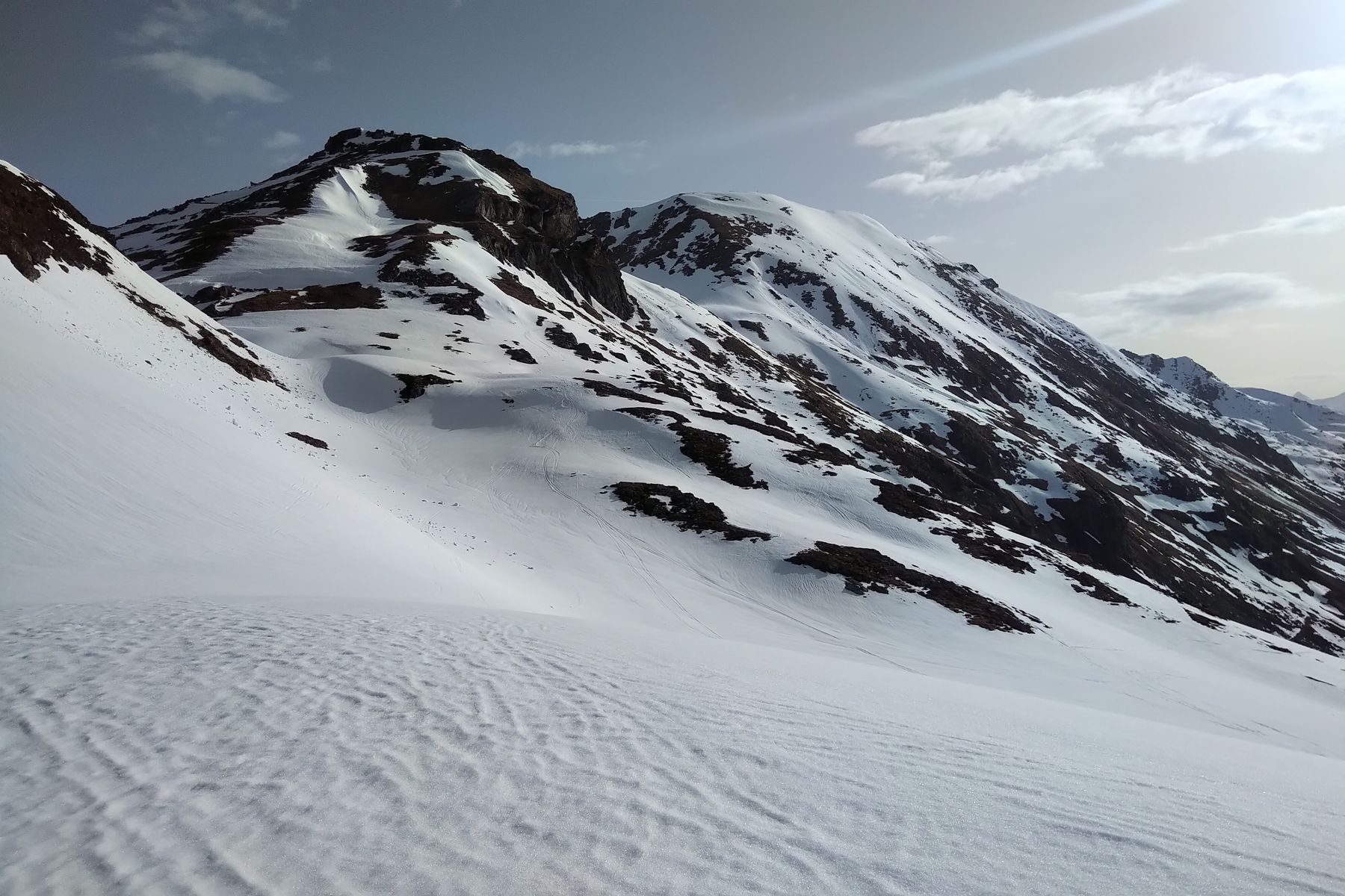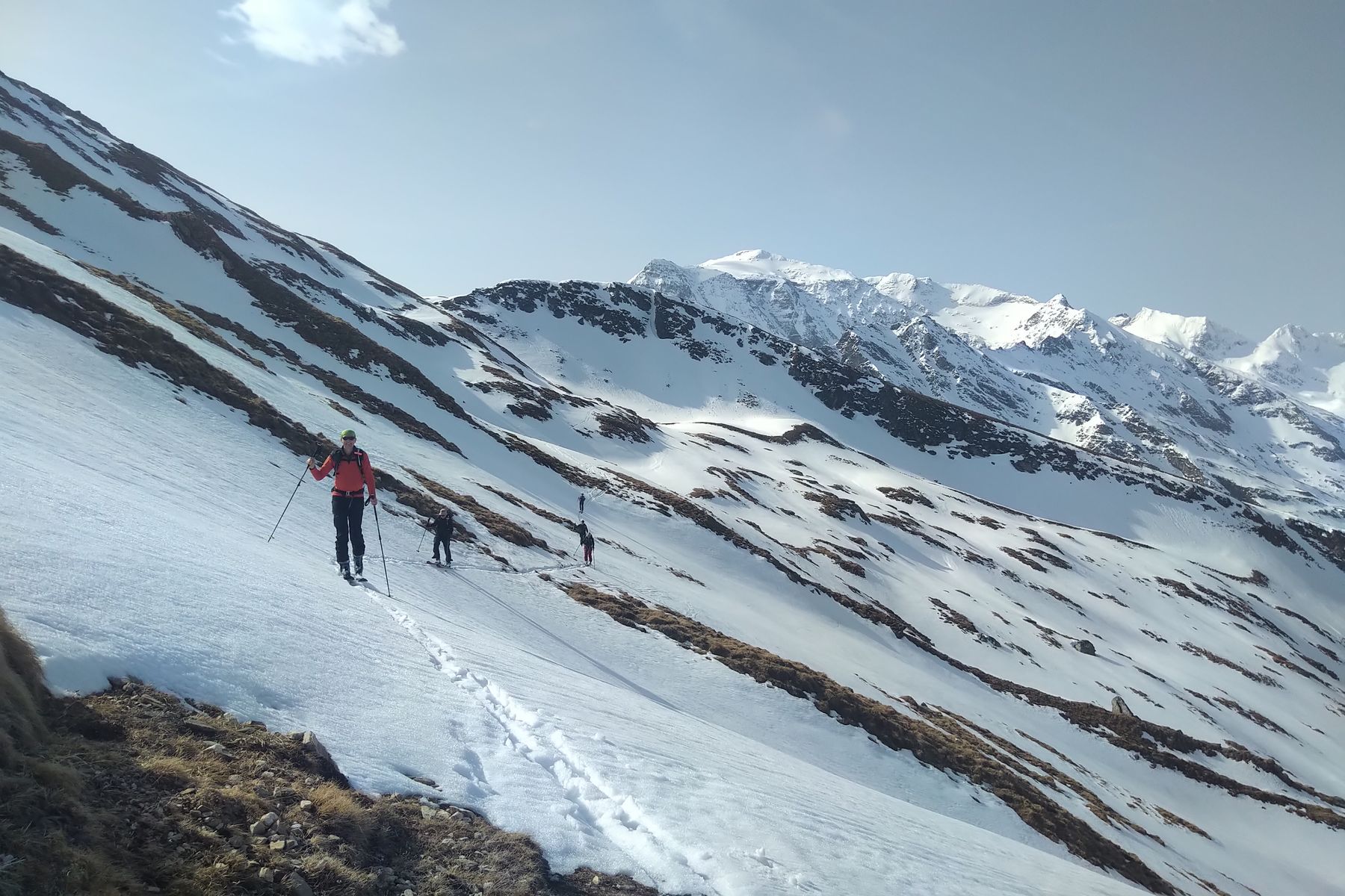 Die nächtliche Abstrahlung war dann an der unteren Grenze der Vorhersagen, so dass wir am Sonntag eine andere Tour ausgesucht haben. Diese Tour (Alternativroute zum Silberpfennig) hat sich im Nachhinein aber als sehr schön herausgestellt! Wir sind über die Filzenalm und das Filzenkar in den Sattel nördlich vom Bockhart aufgestiegen (der Name war heute unpassend). Die Normalroute zum Silberpfennig hat uns wenig angesprochen, so dass wir auf 2300 kurz nach Norden abgefahren sind und nach einer längeren Querung übers Silberkarl zum Silberpfennig aufgestiegen sind. Eine schöne einsame Route und später eine tolle Abfahrt ins Silberkarl!