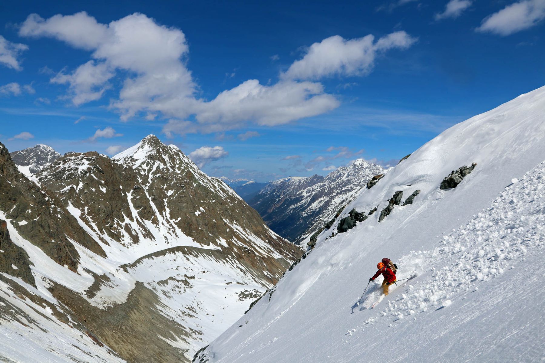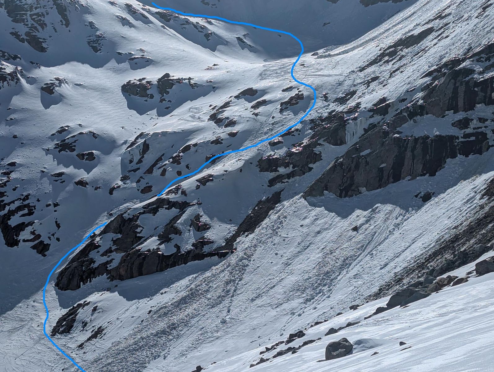 Warum wir im Anschluss die Einzigen waren, die am Samstag über die tollen Gletscherflächen des Sulzenauferners zur gleichnamigen Hütte abfuhren, wurde am steilen Talschluss klar. Dort konnten wir uns gerade noch so zwischen den Felsen durchmogeln. Als Belohnung folgte tief durchnässter Schnee. Auf den Gletscherflächen selbst lag hingegen gut zu fahrender gesetzte Powder. Die Spaltenzonen sind wirklich gut eingeschneit.