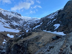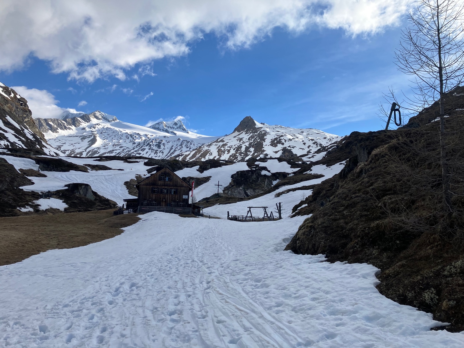 Start Samstag in Hinterbichl am Parkplatz im Ort. Meistens wird am oberen Parkplatz (Wiesenkreuz) gestartet, was den Aufstieg um eine knappe halbe Stunde verkürzt. Aufgrund des schneearmen Winters (obwohl die Venedigergruppe heuer insoweit noch vergleichsweise gut bedient wurde) und der hohen Temperaturen zuletzt muss doch weit ins Dorfer Tal getragen werden: Bis zum Almhütterl auf ca. 2.020 m etwas vor der Johannishütte. Bis dorthin könnte auch geradelt werden, wobei (fast) alle, die das gemacht haben, mit einem E-Bike unterwegs waren - es gibt schon steile Passagen. Das sog. "Venediger-Taxi" (Fahrdienst mit Kleinbus, das so etwas im Nationalpark überhaupt gemacht wird - aber wohl außerhalb des eigentlichen NP-Geländes) fährt derzeit nur bis auf ca. 1.800 m, weil noch mehrere Schneefelder die Straße für den motorisierten Verkehr sperren. Je nach Ausgangspunkt und Herangehensweise (Fuß oder Radl) ist man schon gute 2 h bis zur Johannishütte unterwegs - und dort beginnt nicht nur der durchgehende Schnee, sondern auch die eigentliche Tour.