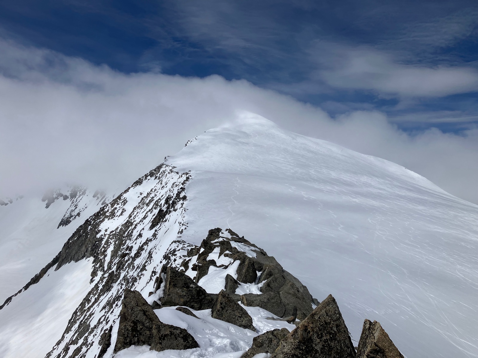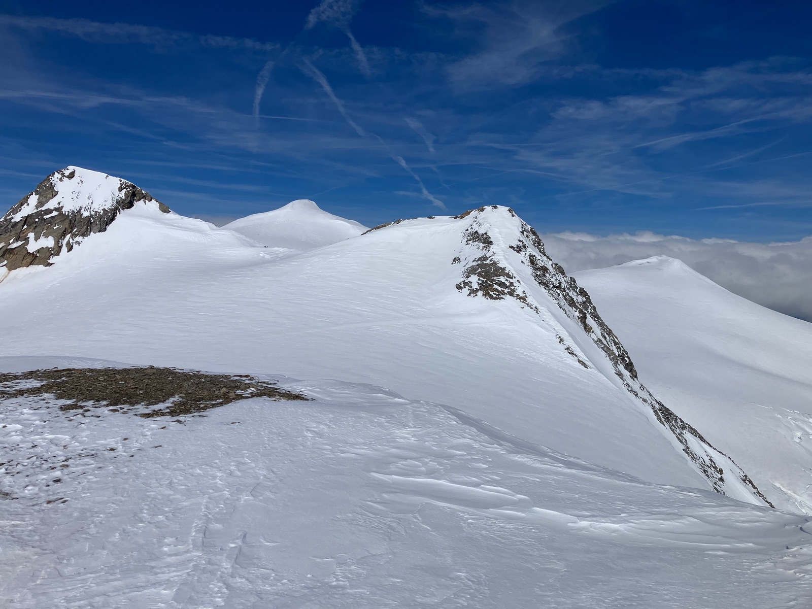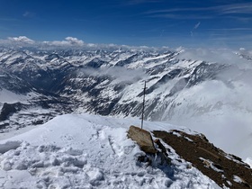 Vom Hohen Zaun kurze Fellabfahrt und gleich weiter zur Schwarzwand (auch Schwarze Wand). Nur die allerletzten Meter zum Gipfel muss man kurz zu Fuß steigen. Dann wiederum kurze Fellabfahrt und hoch zum Rainerkopf. Die letzten Meter des nordseitigen Anstiegshanges waren recht hart, deshalb die Empfehlung - anders als ich - rechtzeitig Harscheisen anzulegen oder gar auf Stapfen mit Steigeisen umzuschwenken. Der Rainerkopf ist übrigens jener Gipfel, den man von unten lange markant sieht (und nicht der Großvenediger). Vom Rainerkopf könnte man abfahren, aber angesichts recht harten Schnees habe ich mir das geschenkt und bin kurz zu Fuß hinunter, um dann das Schlatenkees in einem Bogen zur Venedigerscharte zu queren und dann hoch zum Kleinvenediger zu steigen. Hier (und auch sonst auf der Nordtiroler Seite) leider dichter Nebel - lustigerweise genau wie bei meiner früheren Großvenedigertour übers Obersulzbachtal. Keine Ahnung, ob das Zufall war oder ein lokales Wetterphänomen.