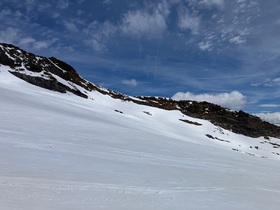 Die Nacht auf Sonntag war dann als bedeckt vorausgesagt und auch eher warm - deswegen habe ich für Sonntag nur eine Pistenskitour im Kalser Skigebiet angesetzt (Ganotzkogel). Am Morgen dachte ich mir aber "mei is des kalt" und der Schnee war gut durchgefroren. Also vielleicht wäre mehr gegangen - allerdings brach ich bei der Abfahrt durch die ostseitige Gipfelrinne dann doch übel ein und fand deshalb meinen Frieden mit der anschließenden Pistenabfahrt. Die orografisch ganz linke Piste hat dabei am meisten Schnee und wurde am wenigsten von den Pistenbullys malträtiert. Insgesamt aber schon relativ wenig Schnee und wie man der Webcam entnehmen kann, geht der täglich stark zurück.