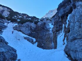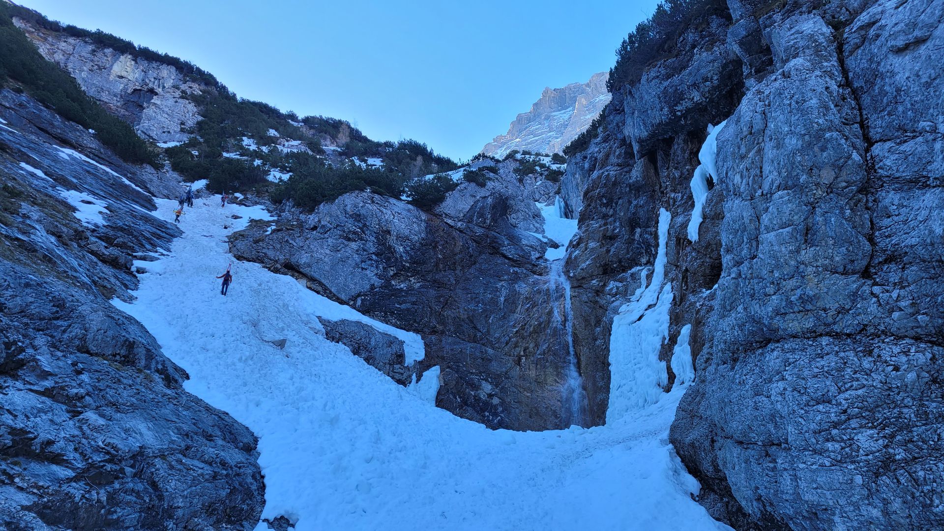 Links neben dem Wasserfall über eine Steilstufe zu Fuß über Lawinenboller hinauf. Dort sind nicht mehr alle Schneebrücken über den fließenden Bach tragfähig. Weiter über teils vereiste splittrige Felsbrocken mit kleinen Tritten etwas heikel hinauf zur Wasserleitung + dem Weg.