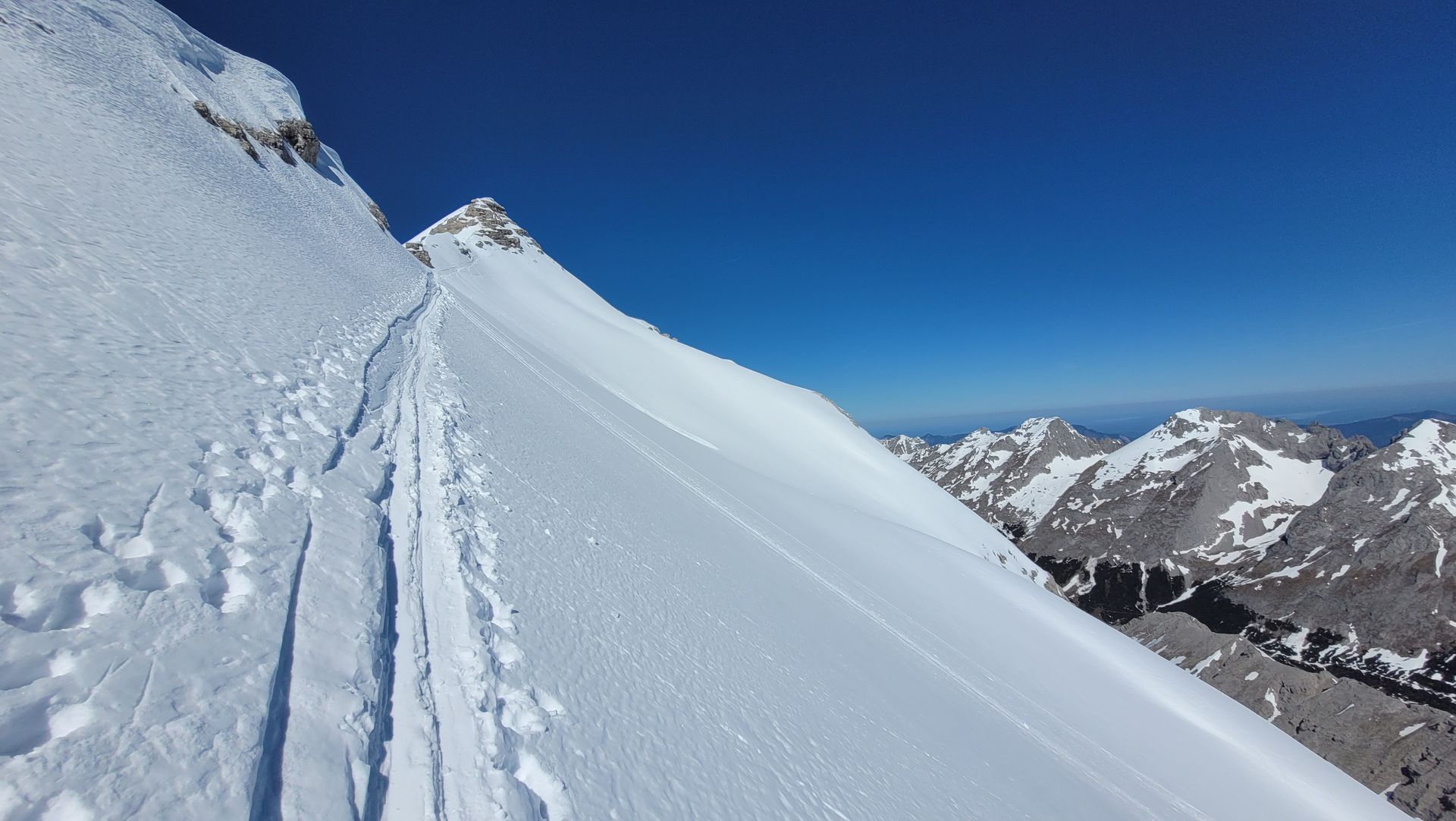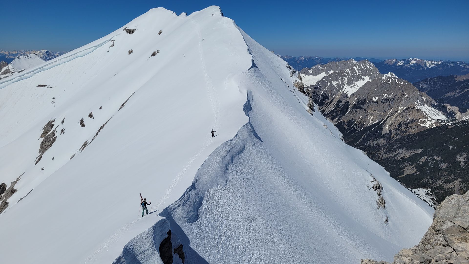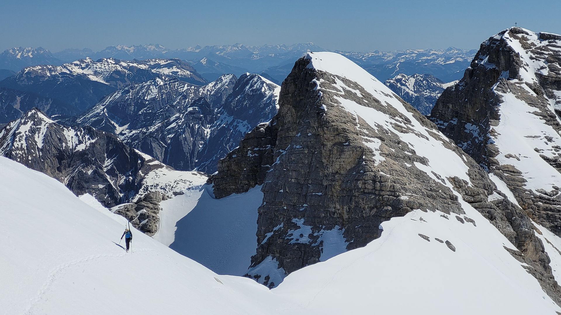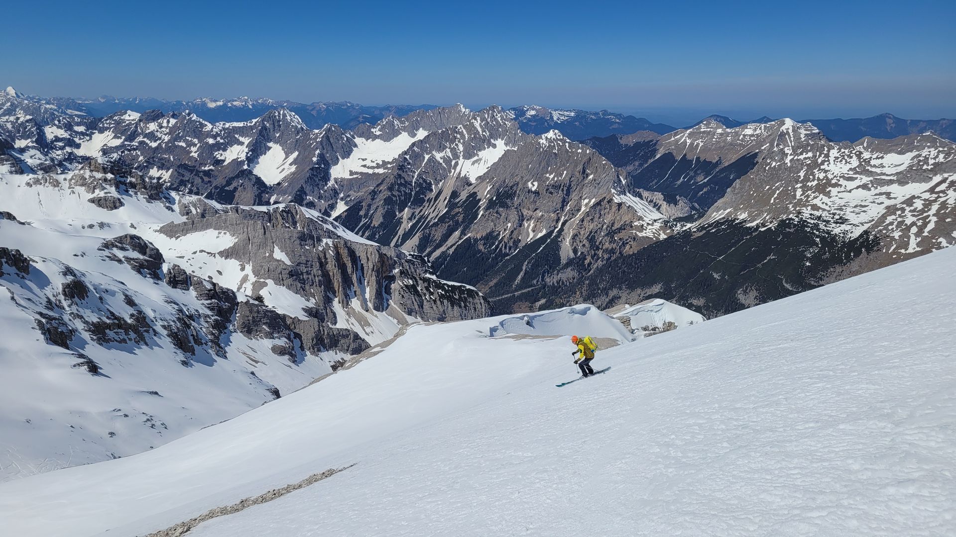 Weiter zum Schlauchkar hinauf. Im oberen steilen Abschnitt eine exzellente Spur zur Ödkarscharte. Zur Birgkarspitze waren einige unterwegs. Wir haben auf dem weiteren Weg nur ein Duo gesehen.
