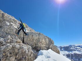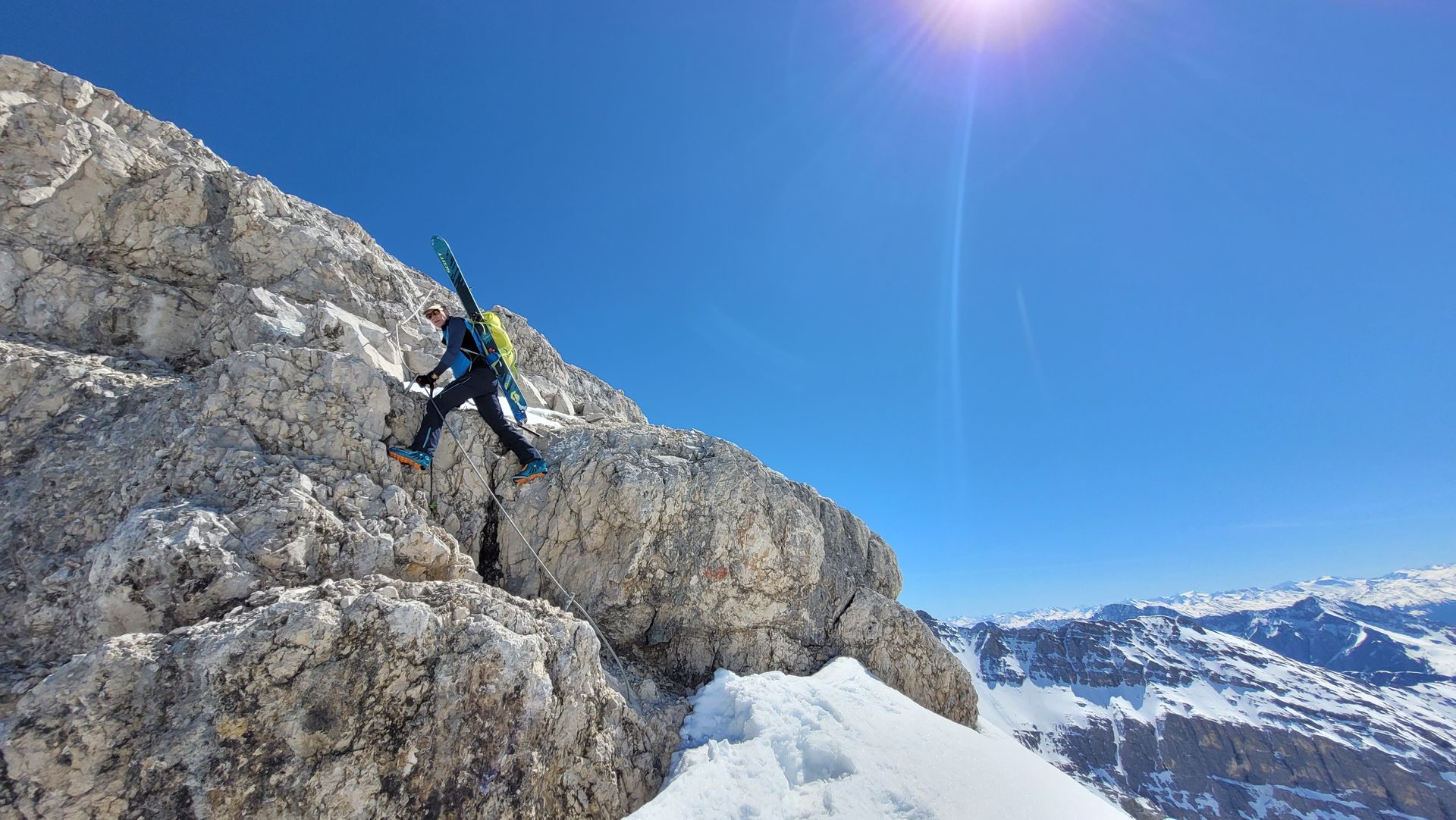 Zu den Ödkarspitzen z. T. an Drahtselen (hälftig noch schneebedeckt + nicht komplette Strecke versichert) hinauf mit I er Kletterei zum Gipfel. Kleinsplittrig! Absturzgefahr.