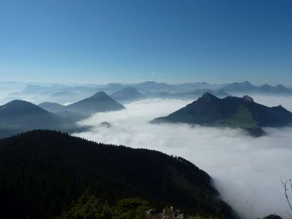 Tourenverhältnisse: Bei Hochnebel und zapfigen 6° hinauf zur Wagneralm, dort endlich Sonne. Dann weiter nach Osten ansteigend, vorbei an der Genossenschaftsalm. Bei einem Abzweig nach links zur Feichteckalm und weiter zum Sattel, Radl-Depot. Danach zu Fuß zum Gipfel. Hier nur wenige Leute, im Gegensatz zur gegenüberliegenden Hochries.