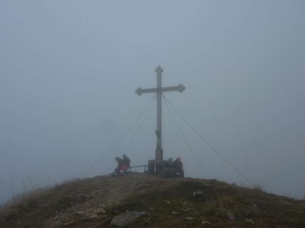 Nun im Nebel gegenüber den Hütten hinauf bis zum Hirschberghaus und weiter zum Gipfel. Heute keine Sonne, leider. Noch nicht mal die Anwesenheit des berauf/bergab-Urgesteins Hermann Magerer, am Berg, konnte den Planeten gütig stimmen.
