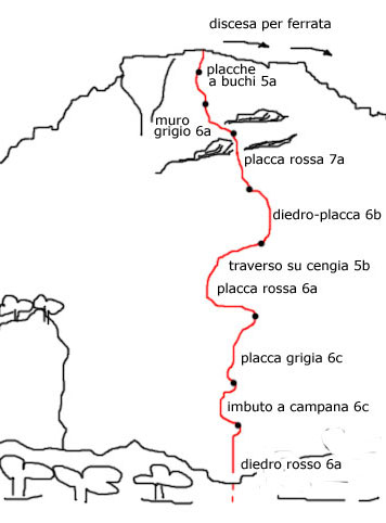 Führt in 9 Längen durch den zentralen Wandteil der Rupe Secca und gehört zu den großen Klassikern in Arco. Anhaltend schwer und nicht ganz anspruchslos, teilweise speckig. Die erste Länge ist gleich ein richtiger Aufwacher:-). Mit Bohr- und Normalhaken gut abgesichert. 6a+ Passagen müssen aber zwingend zwischen den Sicherungspunkten geklettert werden. Friends für die zweite Länge und Sanduhrschlingen für den Ausstieg notwendig.