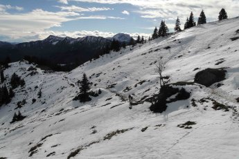 Tourenverhältnisse: zu Beginn sehr warm unter starkem Föhneinfluss und bei strahlendem Sonnenschein. Auf der Ost-/Nordseite schon ziemlich viel Schnee, aber der Weg ist (wie zu erwarten) gut ausgetreten. Der Aufstieg zum Buchstein direkt hinter der Tegernseer Hütte ist schon sehr abgegriffen und rutschig.