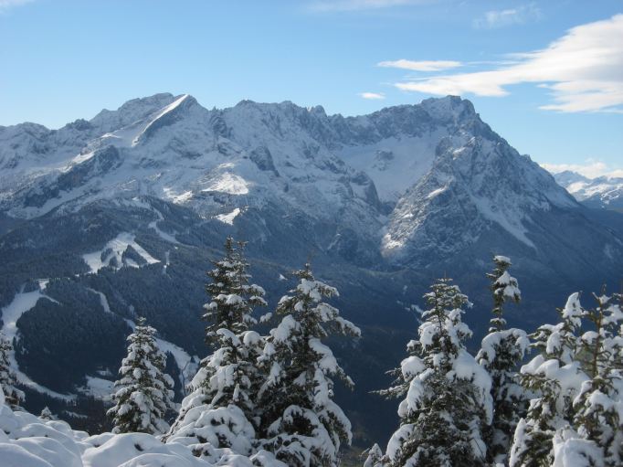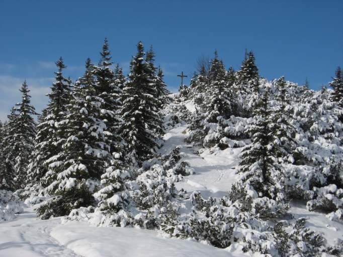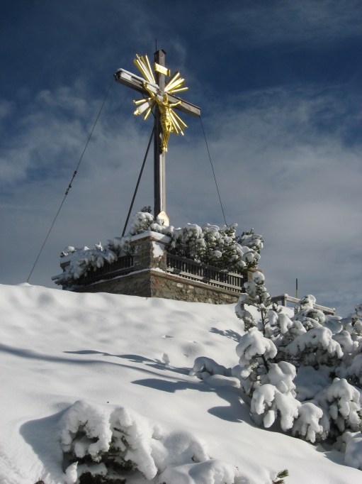 Tourenverhältnisse: Aufstieg (unmarkiert) über Burgrainer Kreuz: etwa ab Höhe der Bahn-Mittelstation durchgehend Schnee (im oberen Bereich so 20 - 30 cm) mit teils batzigem Untergrund (war noch nicht gespurt). Abstieg nach Süden über Eckenhütte und Gamshütte: Weg war schon gut eingegangen; teils matschig, teils Wasserrinnsal, ab Höhe der Bahn-Mittelstation vorwiegend trocken.