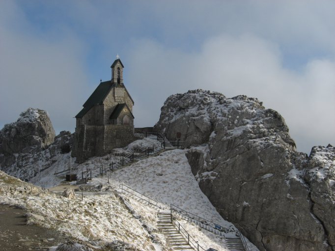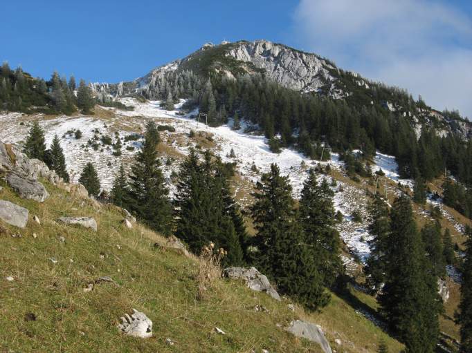 Tourenverhältnisse: Aufstieg über Wendelsteinalm und markiertem süd- und westseitigen Weg zur Bergstation. Wege teils trocken, teils recht batzig, wenig Schnee. Gipfelweg gesperrt, aber problemlos zu gehen (Schneereste). Abstieg von der Bergstation zur Wendelsteinalm in etwa rechts dem Pistenverlauf folgend im oberen Teil (im Schattenbereich) winterlich mit Schnee und Eis. Ab Wendelsteinalm Abstieg wie Aufstieg.
