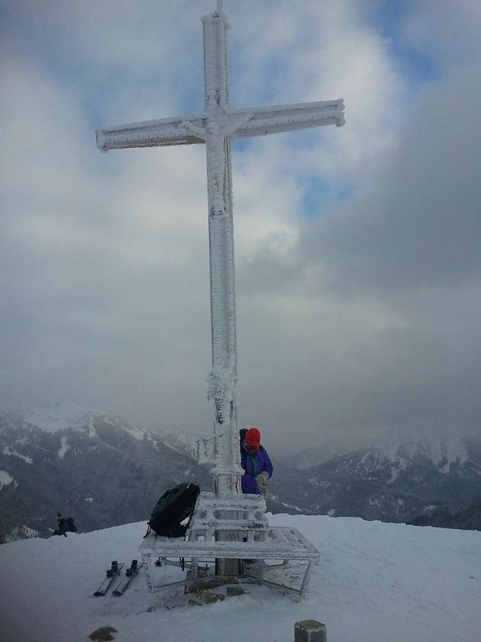 Oben der Gipfelhang stark verblasen und es war eisig kalt, ca. -14 Grad.