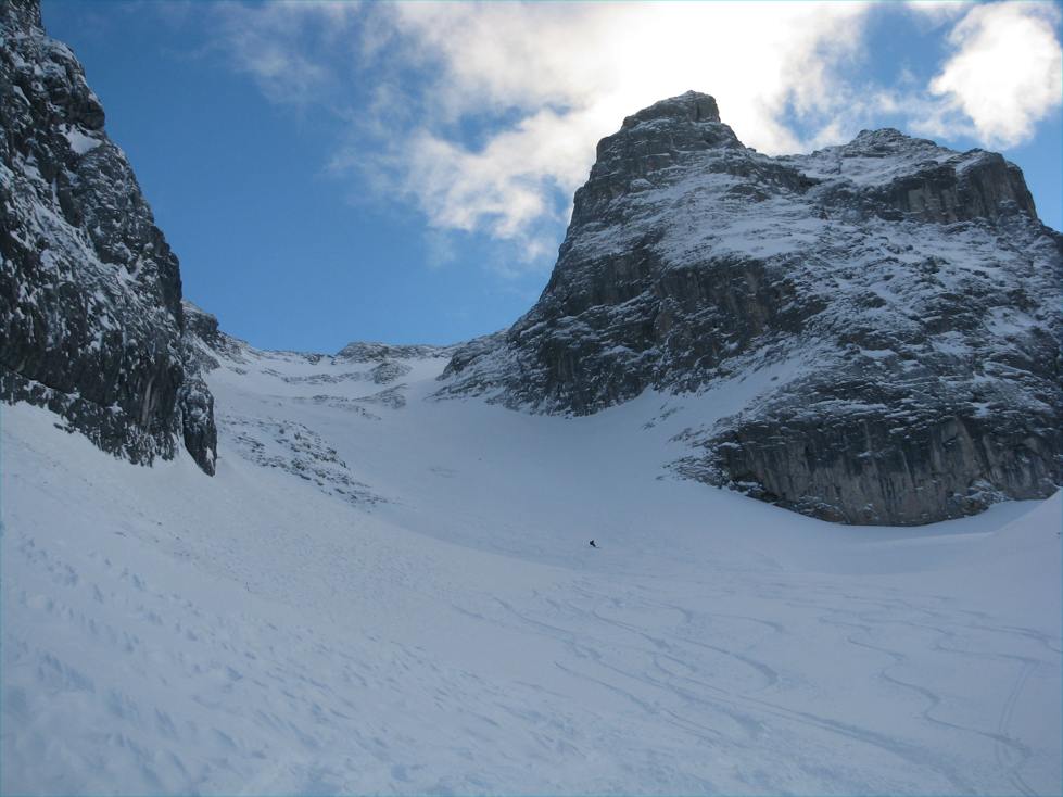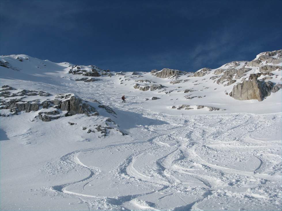 Tourenverhältnisse: meist 10-20cm Pulver auf gut gesetzter Unterlage, nicht übermäßig viel Schnee, daher Steinkontakt manchmal nicht ganz ausgeschlossen, insgesamt aber trotzdem Top-Verhältnisse.