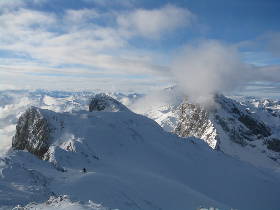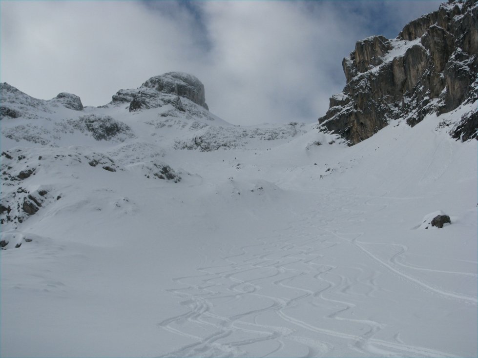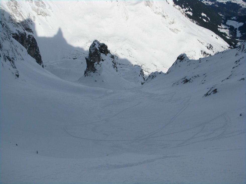 Tourenverhältnisse: meist 10-20cm Pulver auf gut gesetzter Unterlage, nicht übermäßig viel Schnee, daher Steinkontakt manchmal nicht ganz ausgeschlossen, insgesamt aber trotzdem Top-Verhältnisse.