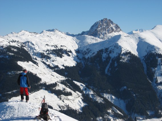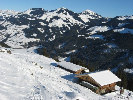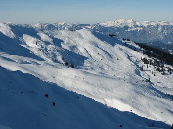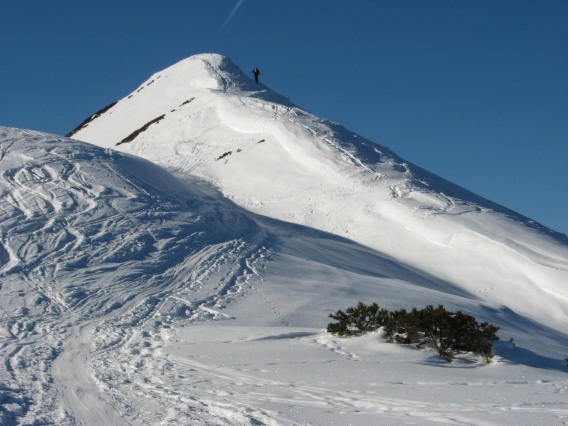 Tourenverhältnisse: gut (deutlich besser als gestern am Feichteck)! Abfahrt vom Gipfel bis zur Oberen Steinbergalm mit 15 - 20 cm Pulver auf guter Unterlage; unverspurte Abschnitte gab's auch noch. Weiter bis zur Wallernalm auch pulvrig, aber meist zammgfahrn. Der Hang direkt unter der Wallernalm war dann (wegen möglichen Steinkontakts) besser auf der Forststraße zu umgehen. Zurück zum Parkplatz problemlos auf der gesperrten Mautstraße.