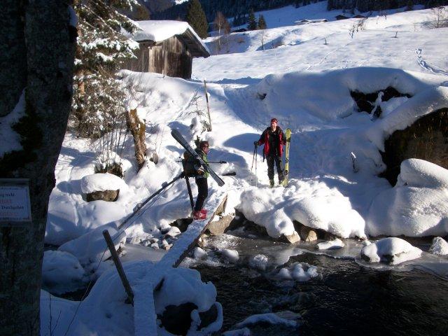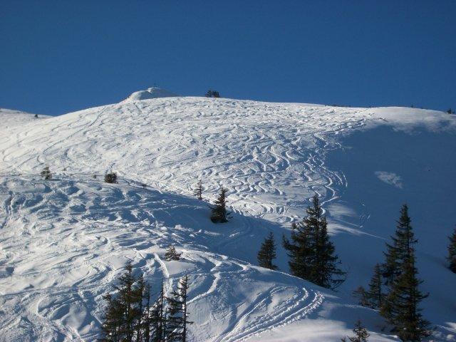 Tourenverhältnisse: Wetter: sonnig, windstill, ein Traumtag. ausreichend Schnee. Fast mit Skier bis zum Gipfel, die letzten Meter getragen. Gipfelhang gut zerfahren, vom Gipfel aus gesehen sollte man sich hier eher rechts halten um Felskontakt zu vermeiden. Abgefahren sind wir nicht der Aufstiegsspur sondern nach Süd-Osten in den Langen Grund, hier sollte man den Spuren folgen um an der richtigen Stelle den bach zu überqueren, von da aus auf vereister Fahrstraße laufen lassen zurück zum Parkplatz. Schnee passabel, ständiger Wechsel zwischen Pulver, Bruchharsch und pistenähnlich eingefahren. Muss man als gute Übung ansehen. Insgesamt dürfte es aber ruhig draufschnein.