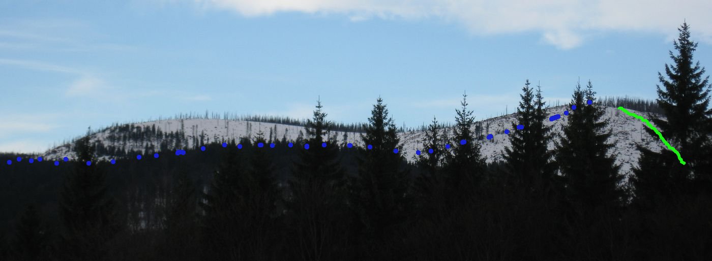Tourenverhältnisse: Mal eine neue Route auf den Plöckenstein (höchste Erhebung des österreichischen Böhmerwaldes) getestet. Man startet direkt an der Liftstation des Schwarzenbergliftes und steigt am Rand der Piste bis zum Zwiesel auf. Dann folgt man dem bewaldeten Kamm, immer leicht bergauf / bergab bis man etwa 200 Hm unterhalb des Gipfels die großen freien Bereiche erreicht (blaue Punkte im zweiten Bild). Dann kann man direkt zum Gipfel aufsteigen. Bis zum Gipfel braucht man etwa 2 Stunden.