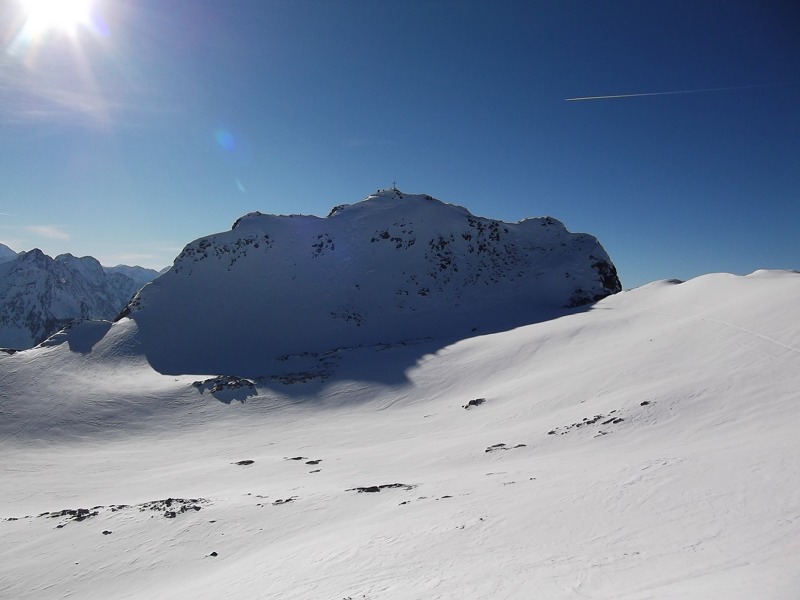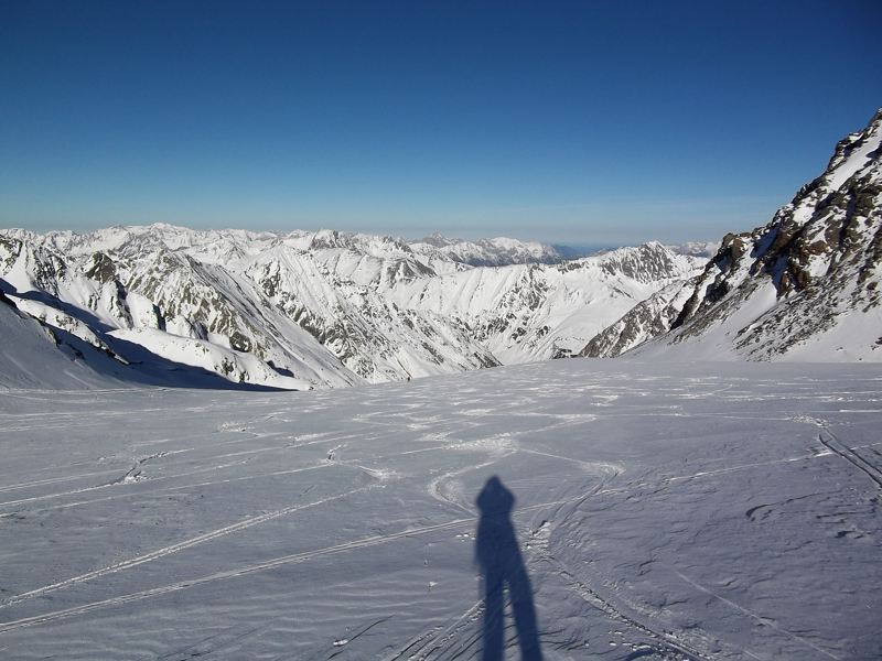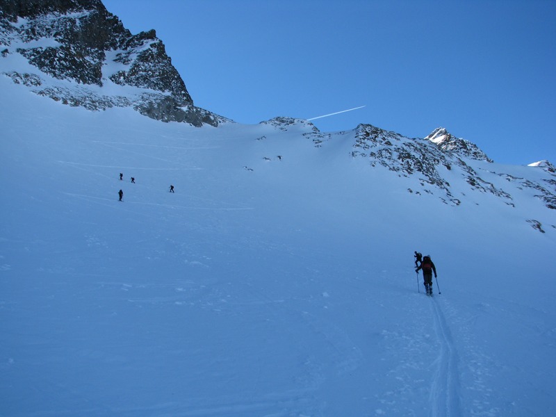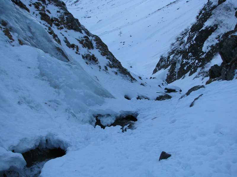 Tourenverhältnisse: besser als erwartet, bis ca. 2300m (unterhalb der oberen Zwing) hart und teilweise Bruchharsch, darüber windgepresster Pulver, insgesamt aber schön zu fahren und für die momentane Schneelage doch recht lohnende Tour. Untere Zwing etwas heikel, der Bach ist zu großen Teilen frei, Harscheisen schaden nicht, obere Zwing völlig problemlos.