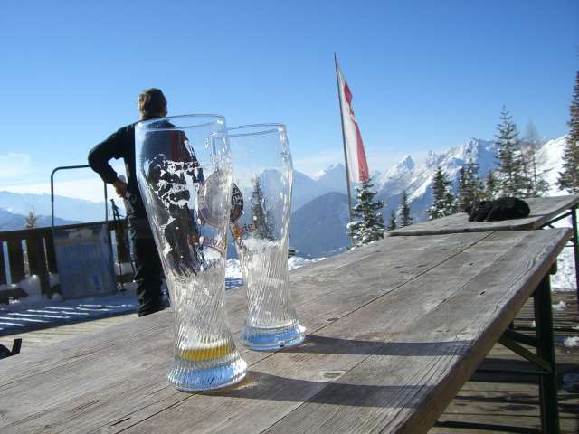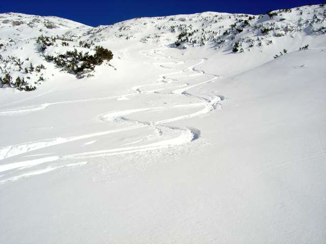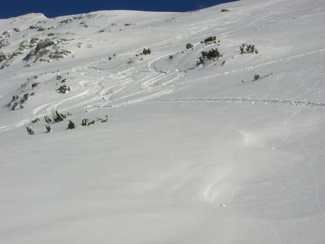 von unten weg mit Ski, im untereb Bereich herrliche Winterlandschaft, Pulver; bei der Abfahrt vom Gipfelhang erwischt man aber zwangsläufig ein paar Steine, da fehlt noch etwas Unterlage, ansonsten traumhafter Powder