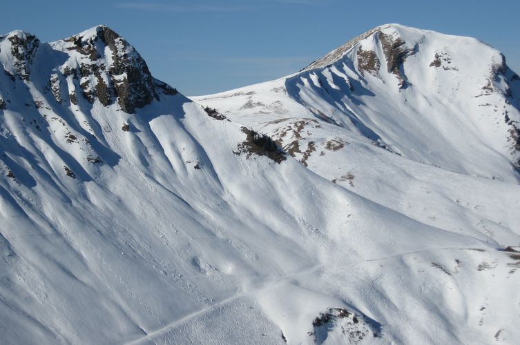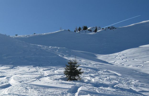 Bei der Abfahrt haben die sonnenseitigen Hänge nur noch schweren Pappschnee, im Schatten findet man noch Pulver. Gerade am Hang unterhalb des Gipfels gibt es noch einige schöne Stellen (2. Bild).