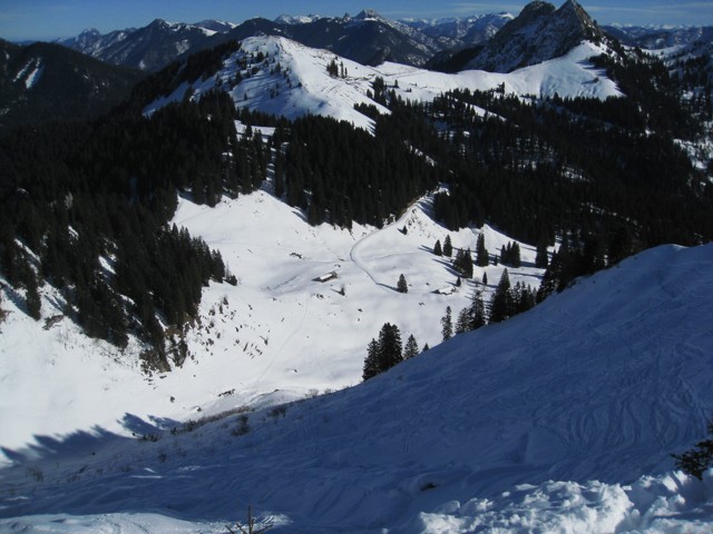 Tourenverhältnisse: Wie Bär Bruno schon beschreiben hat. Osthang des Seekarkreuzes aber noch ganz gut fahrbar. Von den Rauhalmen über Mariaeck zum Schönberg. Der Nordhang war relativ schlecht zu fahren, da schon recht zsammgfahren. Wiederaufstieg zu Mariaeck und Schönberg. Diesmal den Osthang runter. Oben durch zahlreiche Altschneerutsche schlecht. Unterer Teil sehr schön. Vorbei an der Amperthalalm zur Hochplatte. Hier die ersten starken Windböen erwischt. Gipfel ist praktisch schneefrei und direkte Abfahrt zu den Roßsteinalmen ist nicht mehr möglich. Finale Abfahrt daher über den Nordhang bei sehr guten Bedingungen. Rasante Fahrt über die Forststraße (noch sehr gut fahrbar). Es war nicht so warm wie vorhergesagt und die Schneequalität war erstaunlich gut. Überraschend auch, dass kaum Leute unterwegs waren.