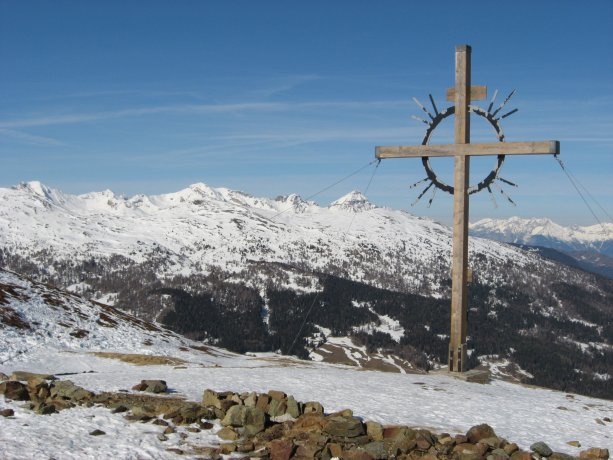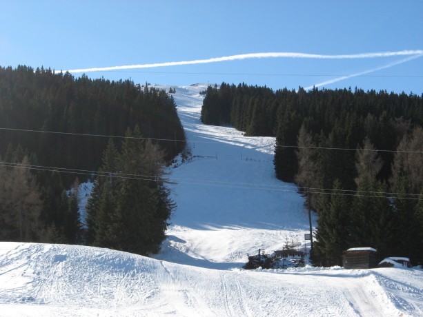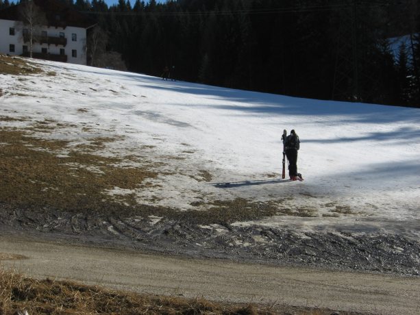 Tourenverhältnisse: Vom Parkplatz (Bild 1) bis zum Gipfel durchgehend Schnee. Die Piste ist - wie der Name schon sagt - pistenartig eingefahren, teils eisiger Untergrund (besonders im unteren Teil). Abfahrt derzeit noch ohne Steinkontakt möglich. Liftbetrieb wurde vor 5 Jahren eingestellt und die Liftanlage mittlerweile entfernt.
