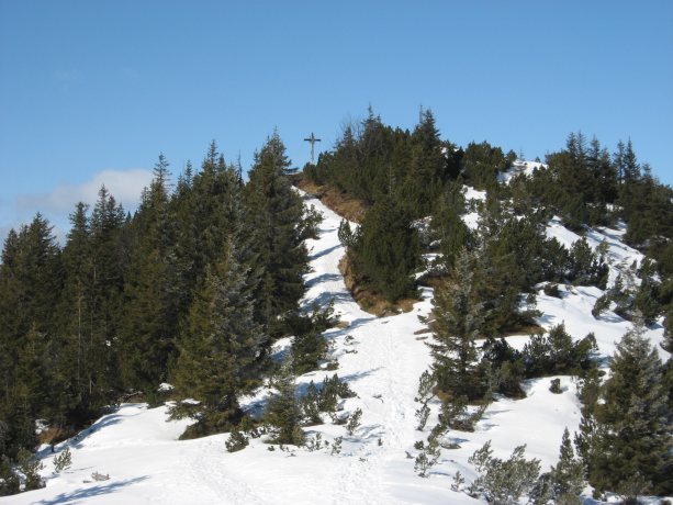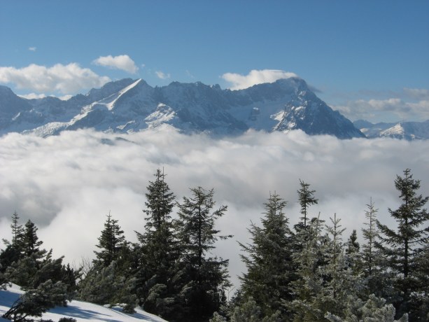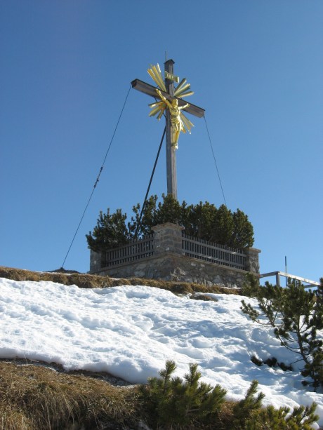 Tourenverhältnisse: perfekte Vorfrühlingswanderung. Kurz Richtung Esterbergalm, vor der Wankbahn rechts hinauf und dann über unmarkierte Wege zum Burgrainer Kreuz und weiter zum Wank. Wege weit hinauf aper oder nur ganz kurze Schneeabschnitte, nur kurz vor dem Burgrainer Kreuz bis zum Wankgipfel schneebedeckt (gesetzter Schnee). Abstieg über Eckenhütte und dann rechts weiter zum Parkplatz. Im oberen Teil Abschnitte mit Schnee oder etwas Eis (Grödeln aber nicht nötig), weiter unten wiederum total aper.