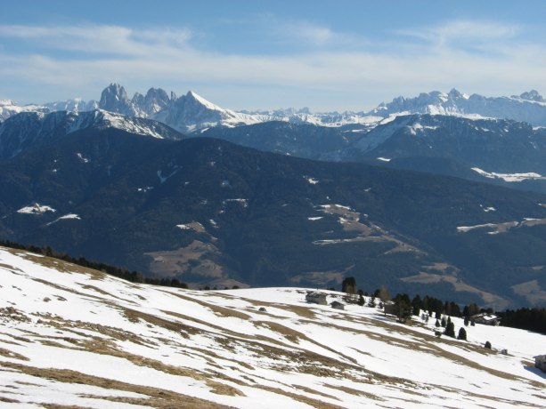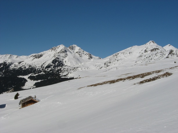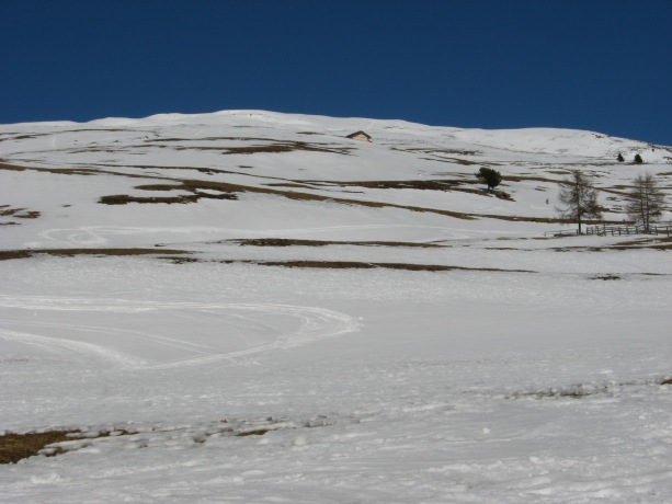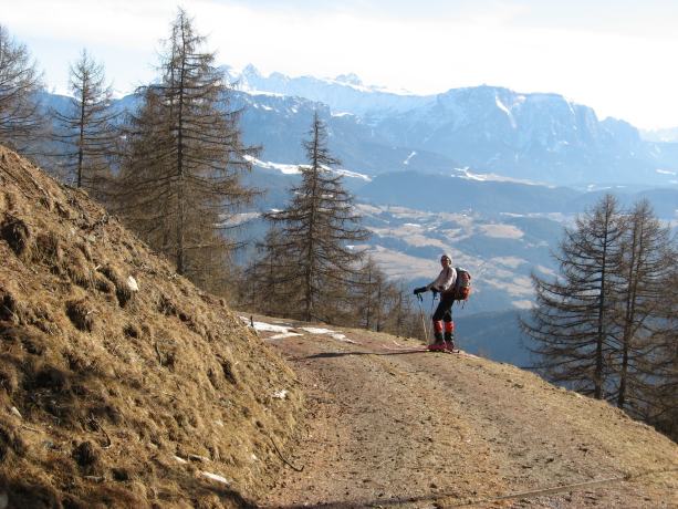 Tourenverhältnisse: vom Parkplatz weg kann man die ersten 150 Hm nicht mehr über die Hänge aufsteigen bzw. abfahren (aper), sondern muss eine Forststraße benutzen (nicht mehr durchgängig mit Schnee bedeckt). Im freien Skigelände liegt anfangs gerade noch ausreichend Schnee. Bei der Abfahrt war viel windgepresster, aber nicht immer tragender Schnee. Firn war nur in Ansätzen vorhanden.