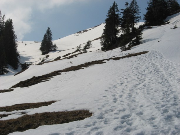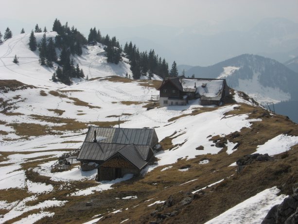 Tourenverhältnisse: Wege waren bis ca. 1200 m aper oder nur etwas schneebedeckt. Beim Weiterweg von Ost nach West wurde der Schnee mehr mit leichter "Einbruchgefahr" (Spur hat nicht immer getragen). Am besten geht man nicht bis zum Joch zwischen Zinnenberg und Klausenhütte, sondern biegt bereits am Südhang nach rechts zur Klausenhütte ab. Der kurze Grataufstieg von der Klausenhütte zum Gipfel war wiederum fast aper.