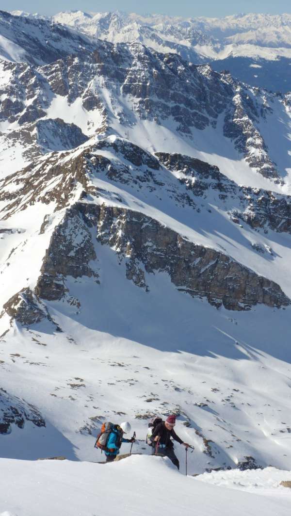 Tourenverhältnisse: vom Gasthaus Wolf eine Viertelstunde Ski tragen (wird wohl schnell mehr), dann bei besten Verhältnissen bis ca 50m unterm Gipfel mit Ski (einige sind auch mit Ski bis zum Gipfel), Abfahrt in schönsten Firn, der an einigen wenigen Stellen auch mal gebrochen ist.